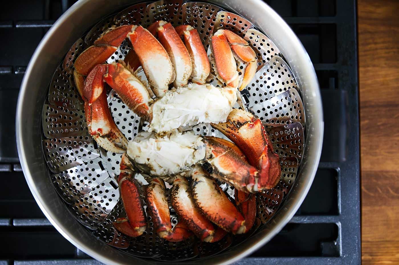 Steaming crab: Fill a large pot with 1 inch of water. Add aromatics like garlic, scallions, ginger, bay leaves, or herbs and bring to a boil. Add crab, cover, and steam for about 4 minutes for thawed crab and about 8 minutes for frozen crab.