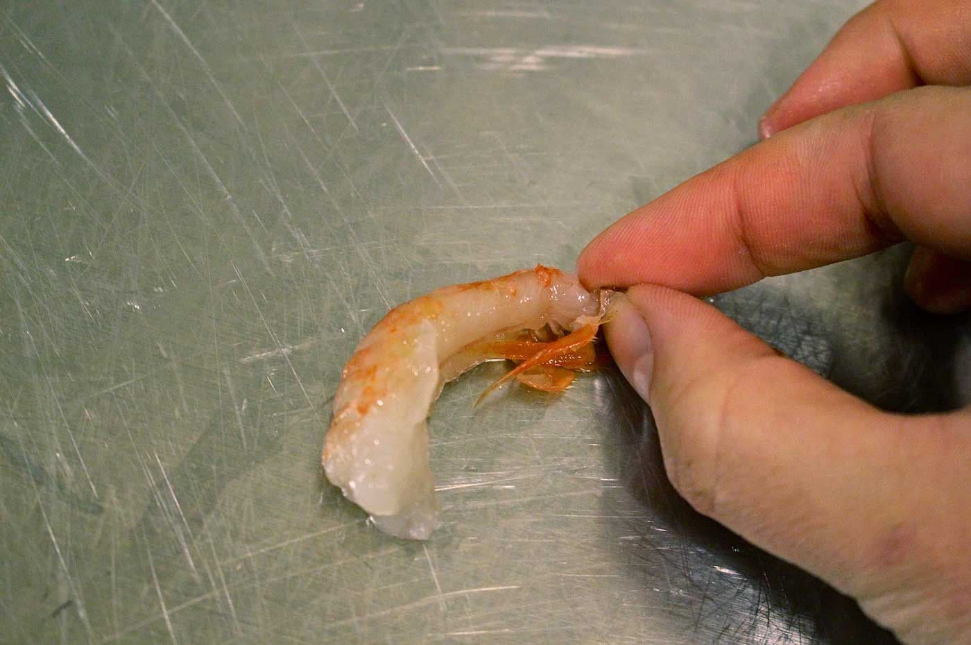 2. Shrimp roe (eggs) can be found on some spot shrimp and has an intense briny, seafood flavor. To remove, pry the semi-frozen roe loose with your thumb in one piece, then rinse the shrimp with cold water.