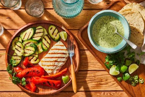Cooking fish on the grill might sound scary, but all you need to do to enjoy this summertime staple is ensure your grill is clean and well-oiled. The halibut is topped with an herbaceous salsa verde and served with grilled zucchini and peppers for a light but hearty summer meal.
