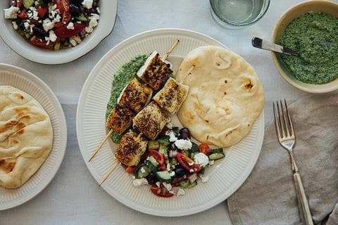 Meaty, Middle Eastern–inspired halibut kebabs—rubbed with a simple mixture of olive oil and za’atar—are so simple, yet so elegant. A creamy, green herb–spiked harissa sauce and a fresh tomato-cucumber-olive salad complete the meal, perfect for any dinner party.
