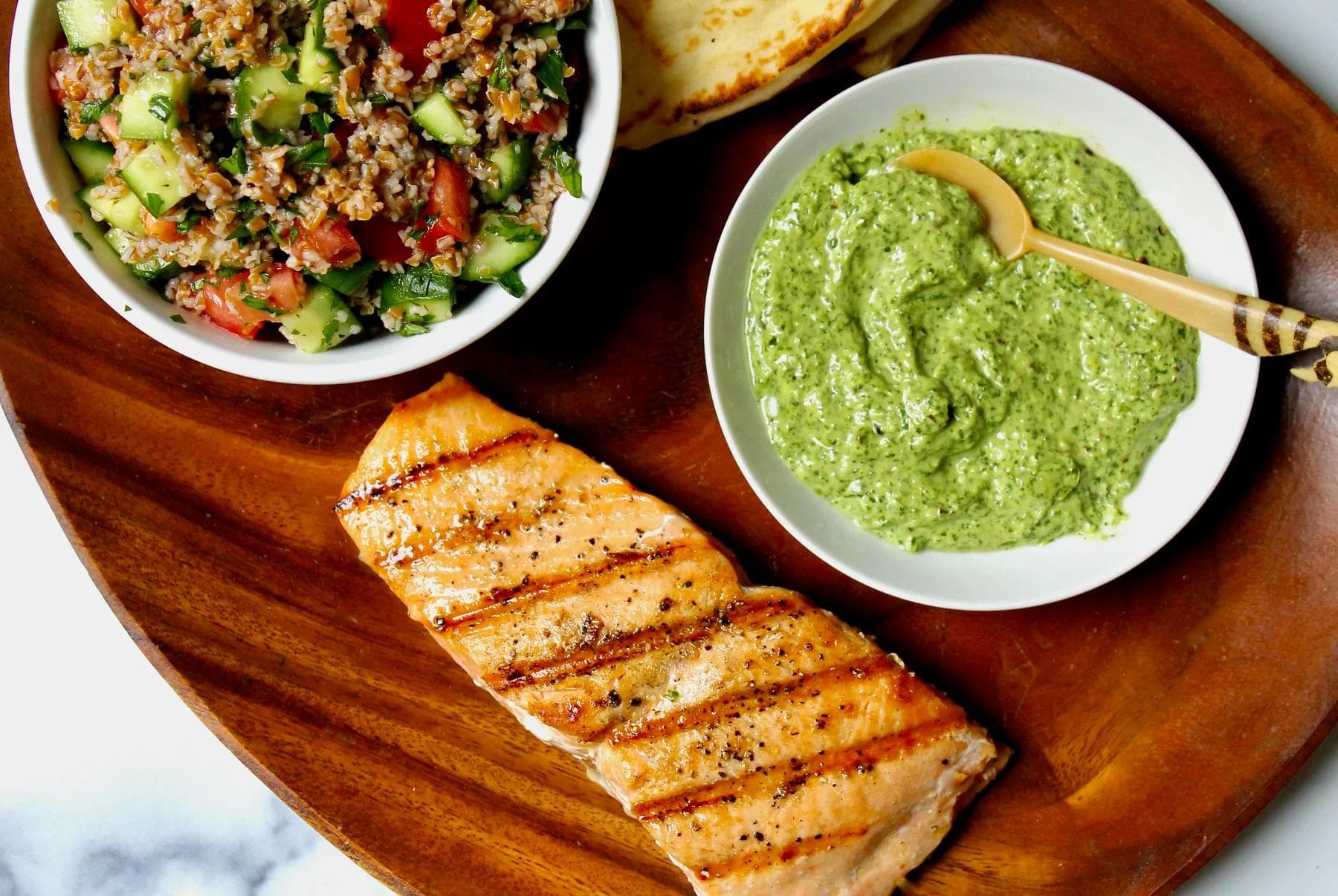 GRILLED SALMON WITH TABBOULEH & FRESH GREEN HARISSA