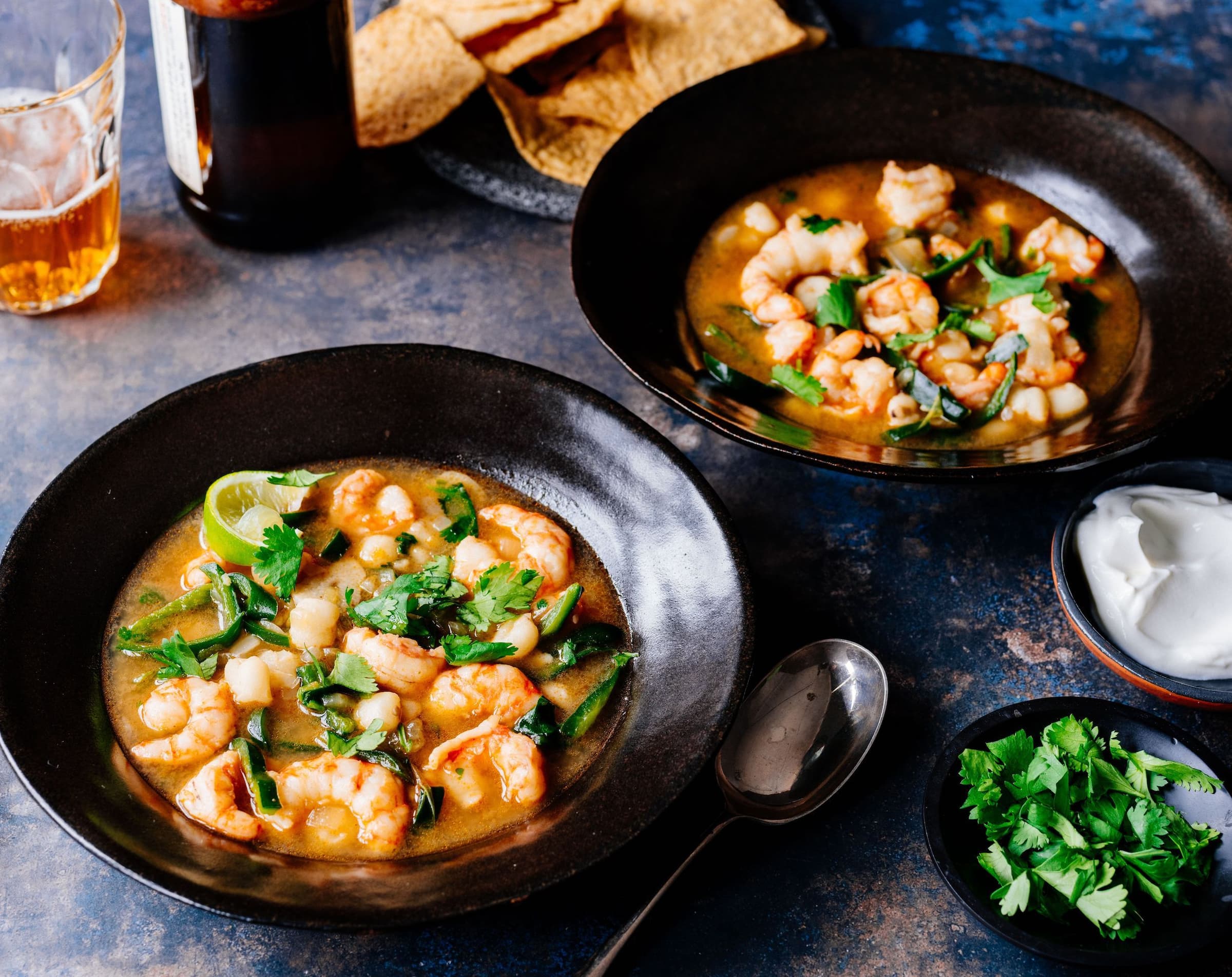 In Shrimp Tortilla Soup, shrimp shells and roe are simmered with clam juice and water for only 15 minutes before building the soup. New England Fish Chowder boosts flavor by sautéing aromatics in rendered smoky bacon fat. Other soups use commercially-made spice pastes or powders — Caribbean curry powder, miso, nam prik pao (for tom yum), gochujang, chipotles in adobo, or Old Bay Seasoning — to add instant complexity.