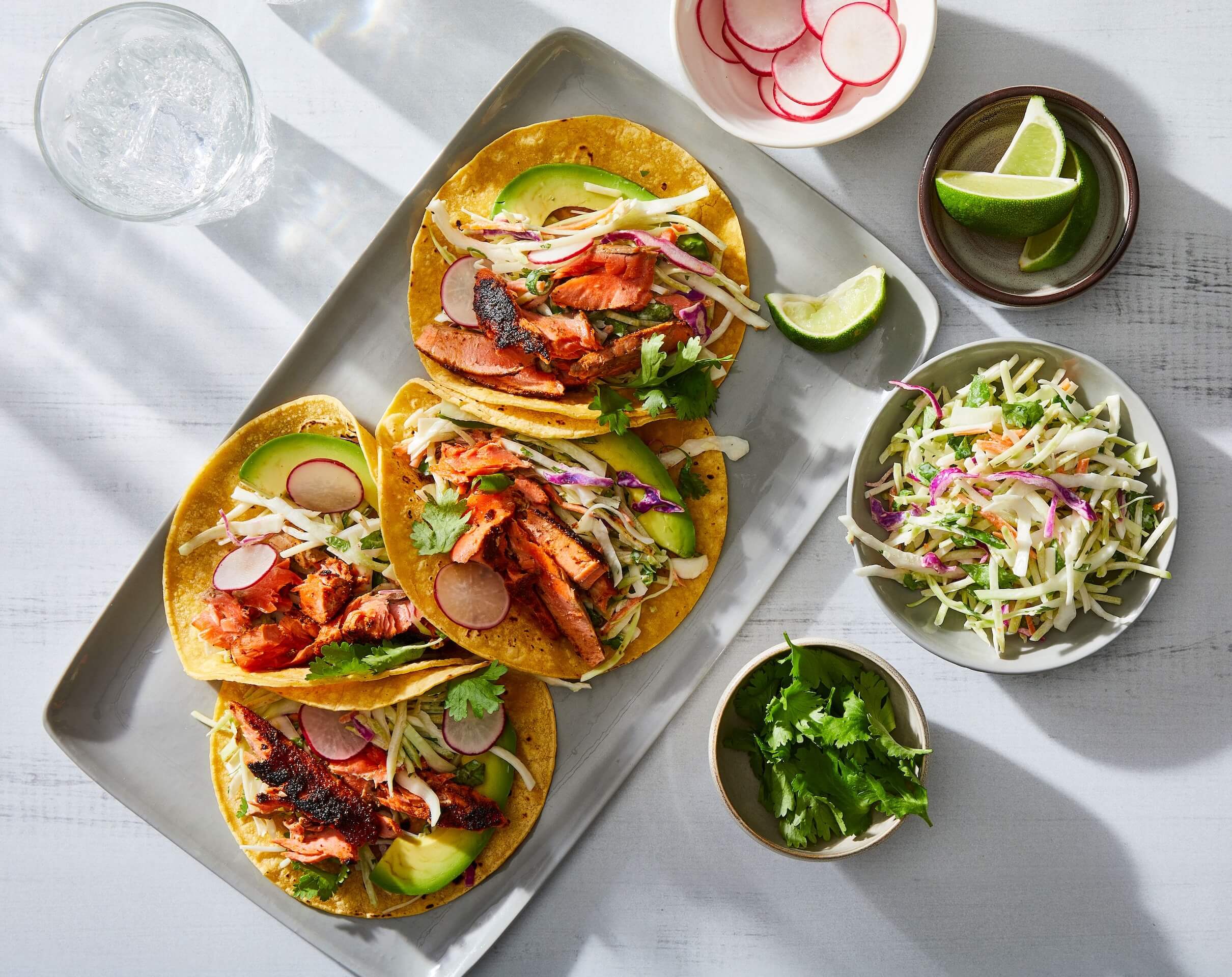 Ingredients: Salmon, tortillas, avocado, cole slaw, lime, radishes