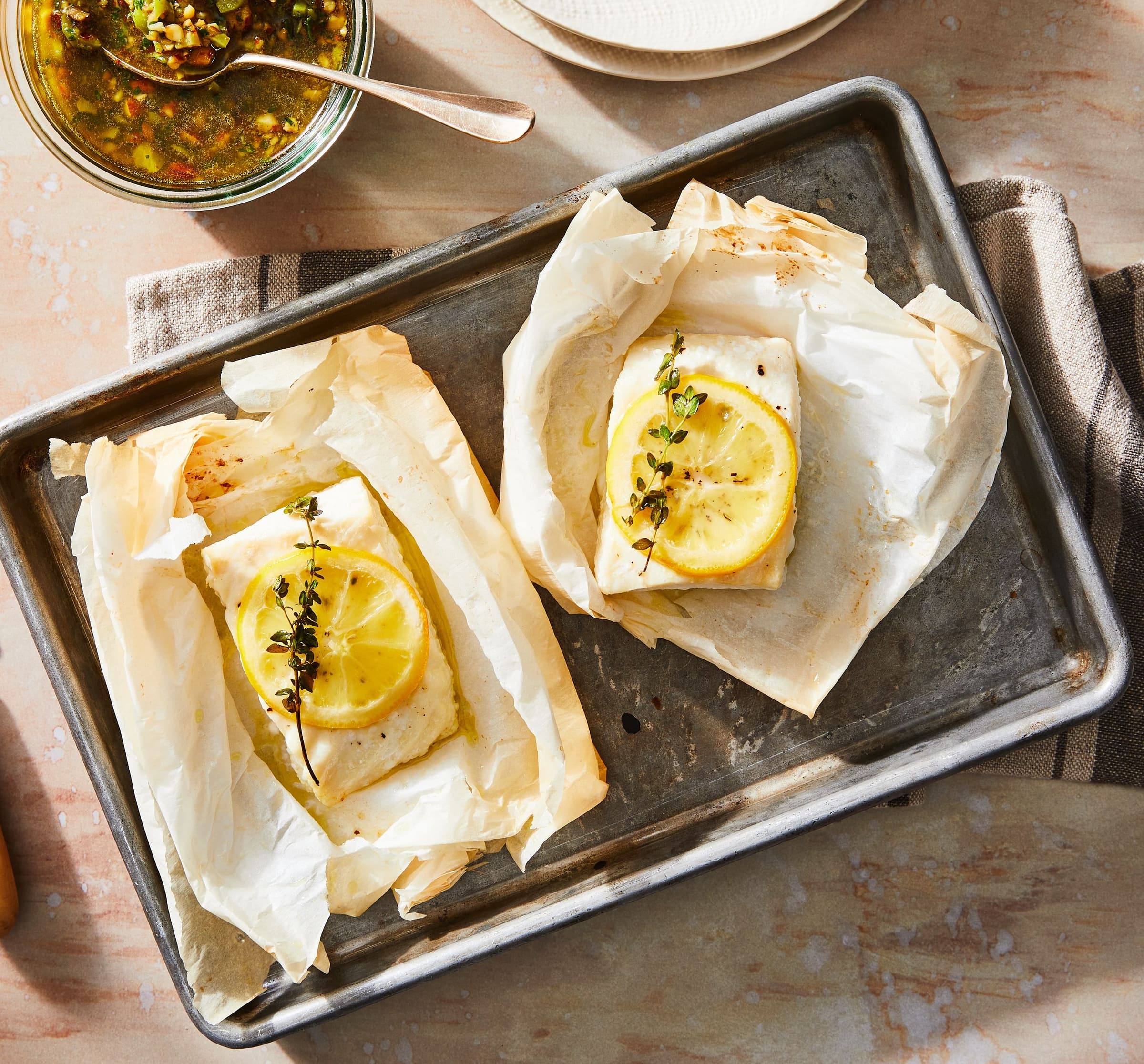Bake, roast, or sauté citrus slices directly with the fish. The halibut in these parchment packets are topped with lemon slices and herbs that infuse the fish with flavor as it bakes in the oven.