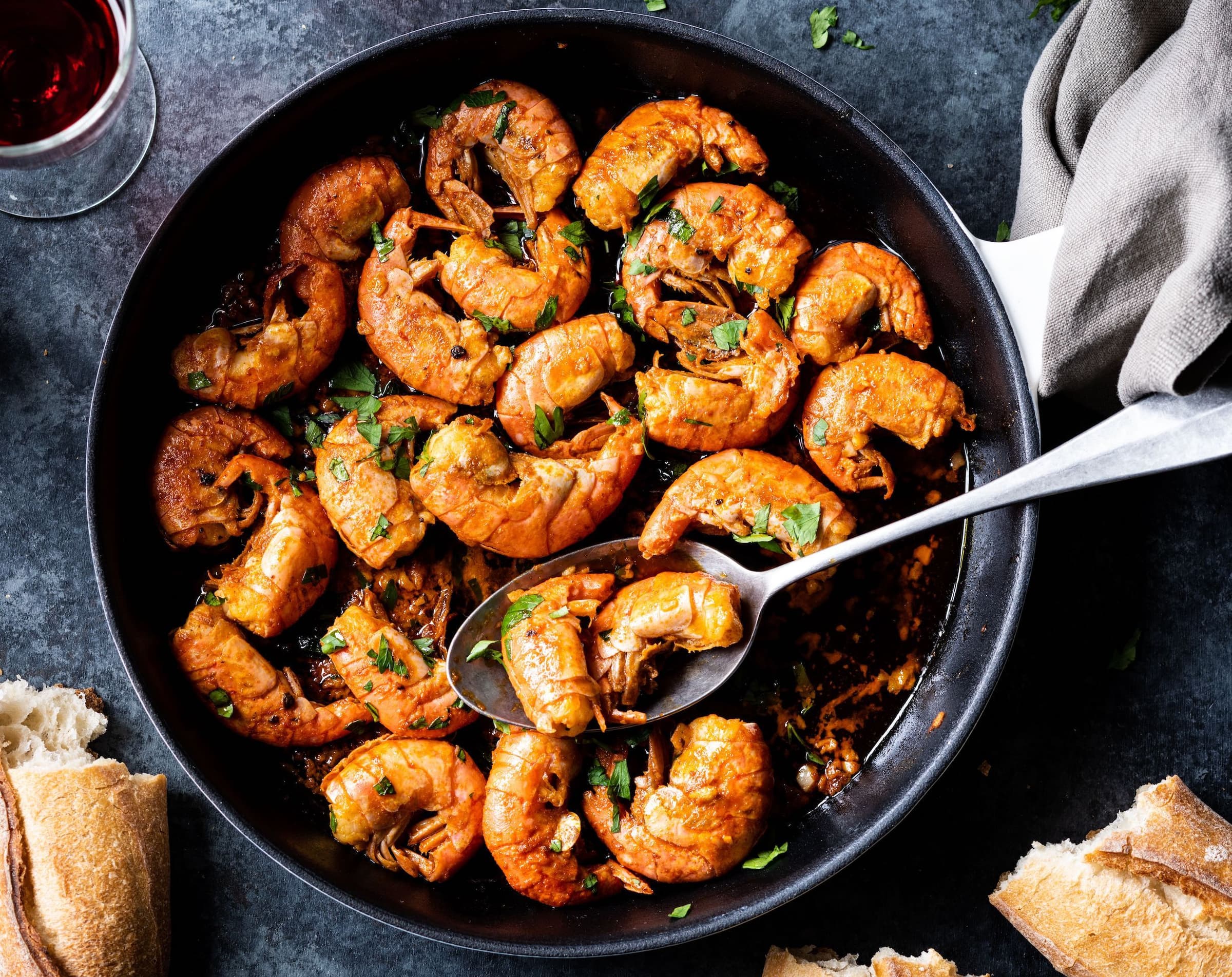 A la plancha is a style of cooking popular in Spain that uses high heat and a flat cooktop (like a griddle) to impart a slightly smoky flavor. Gambas a la plancha, or pan-seared shrimp, is traditionally served with the heads on and in their shells. Ours are halfway there so you’ll still be able to get your fingers a little messy. Thank goodness for napkins!