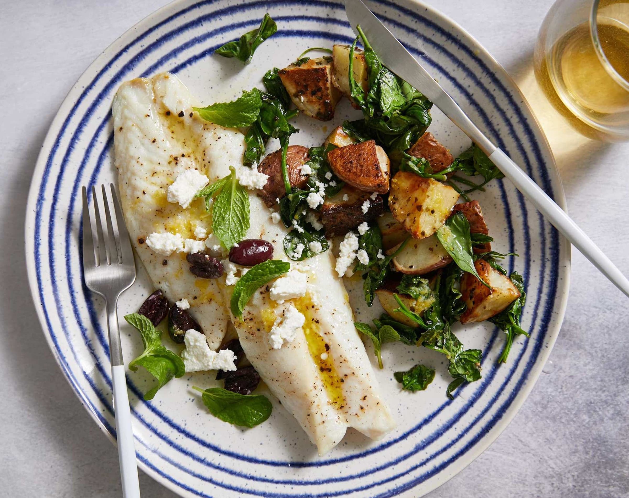 Mediterranean flavors run deep in this simple one-pan supper. Potatoes and tender white fish fillets are roasted and drizzled with lemon juice, oregano, olives, feta, and mint. Throw in a handful of baby spinach for good measure (not to mention iron, calcium, and oh, deliciousness), and dinner is served.