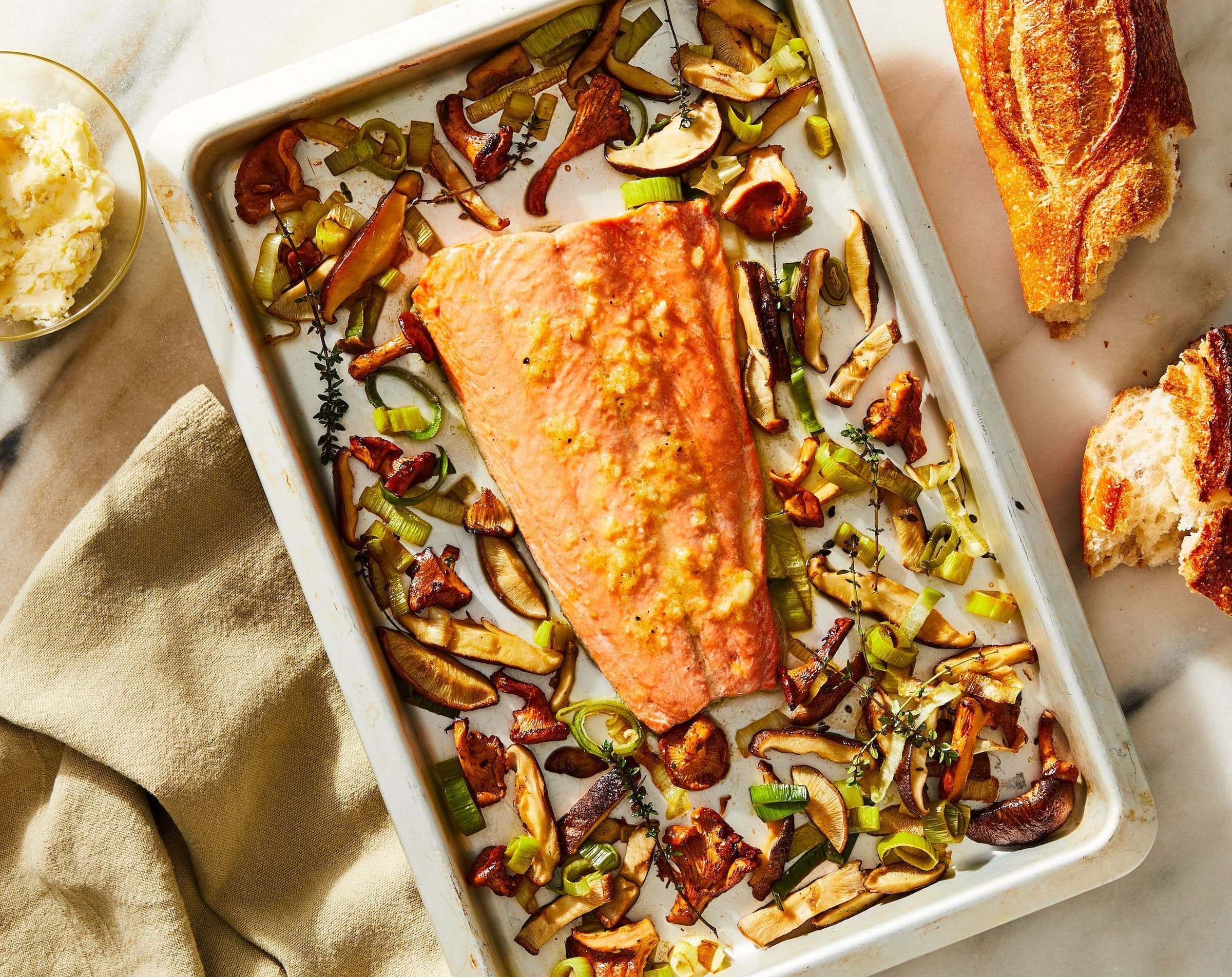 Sheet Pan Salmon with Wild Mushrooms and Leeks