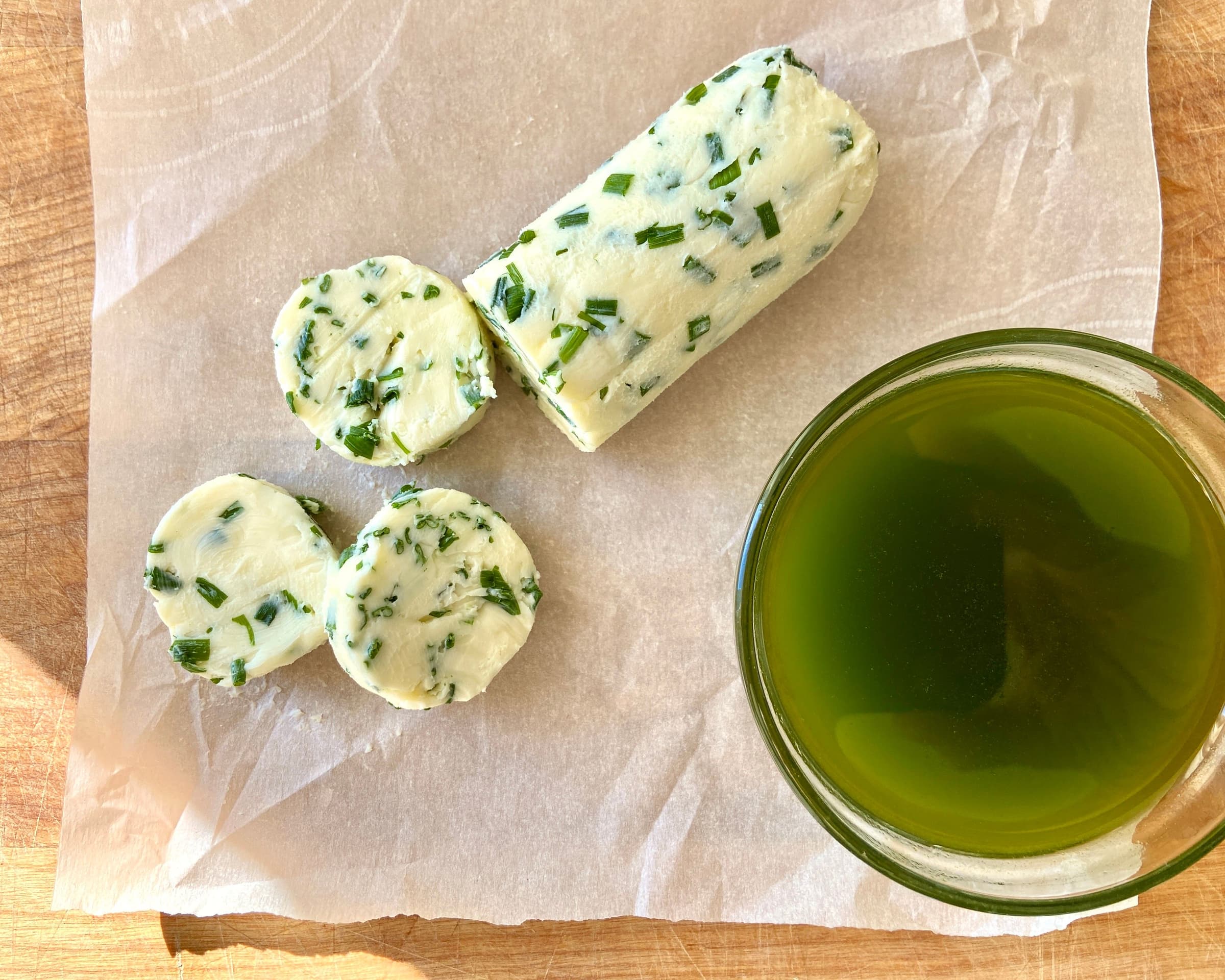 Chive compound butter is even easier to make than chive oil and just as yummy. Simply stir together 2 tablespoons of finely chopped fresh chives with 8 tablespoons unsalted butter and a pinch of salt. Roll the butter into a log using plastic wrap or parchment paper and refrigerate until ready to use. Cut it into slices and melt it over any type of fish dish. If wrapped tightly, the chive compound butter will last for months in the freezer.