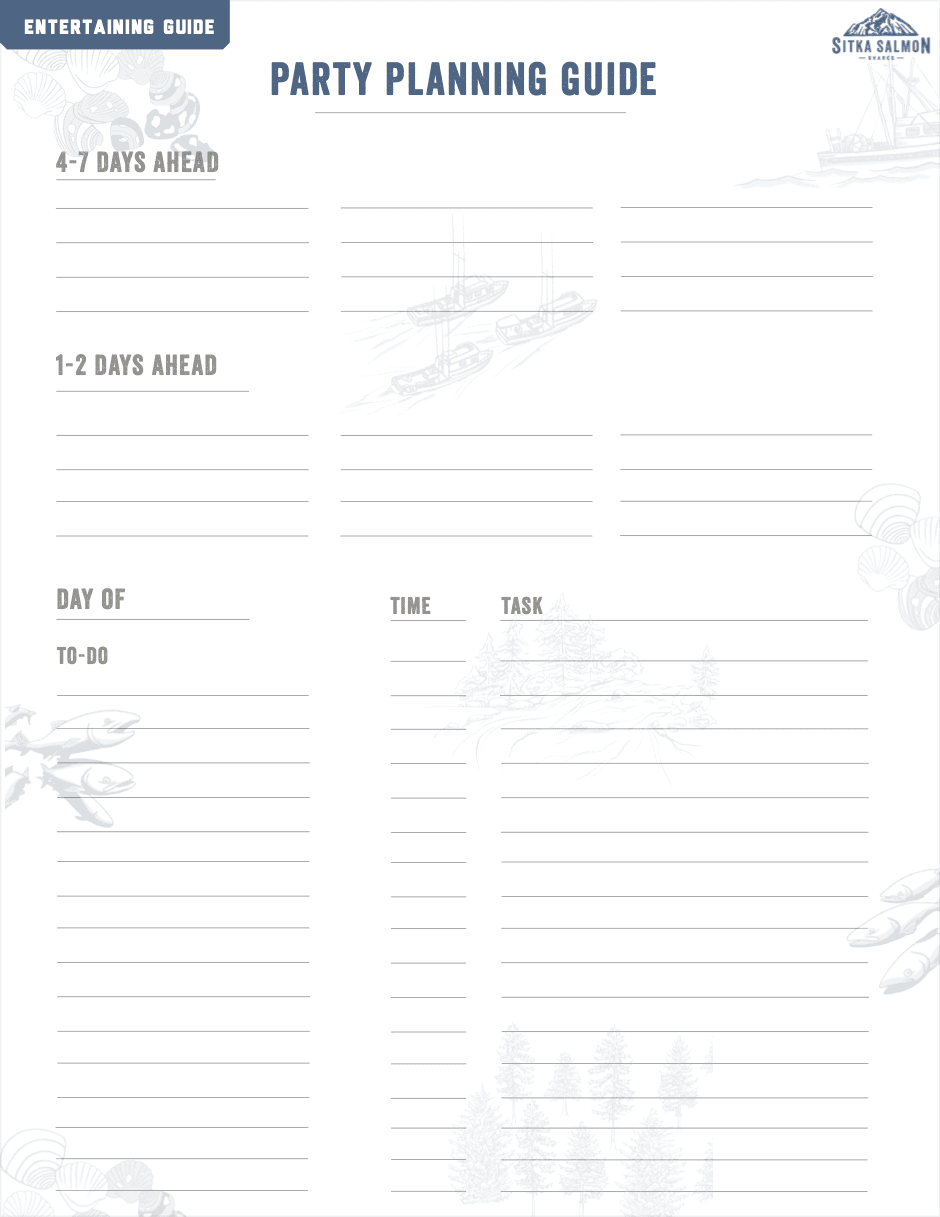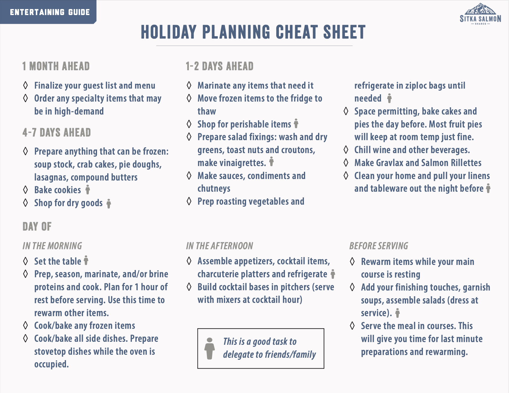 Once your menu is finalized, outline your tasks for the days leading up to the event and create a schedule. Grace recommends organizing your to-do items by how far in advance you can prepare them. To make it easier, we’ve condensed this list into a handy printable cheat sheet and created a template where you can outline your own schedule: