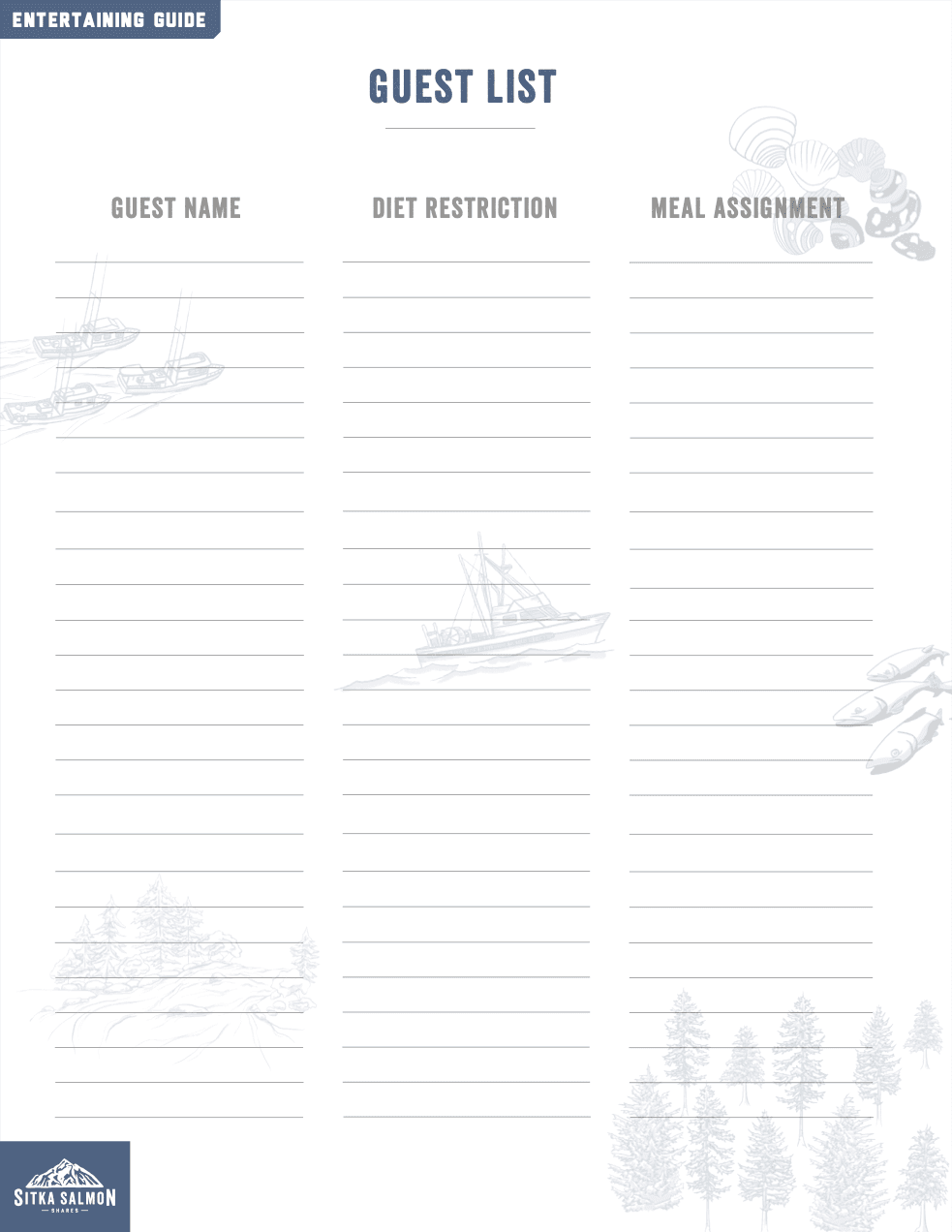 - Confirm your guest list and inquire about any allergies or dietary restrictions — a great celebration is one that reasonably accommodates all in attendance. You don’t have to make a tofu turkey! A meat-free soup and more than one vegetable side (please!) will suffice. Feel free to use our printable Guest List Template below: