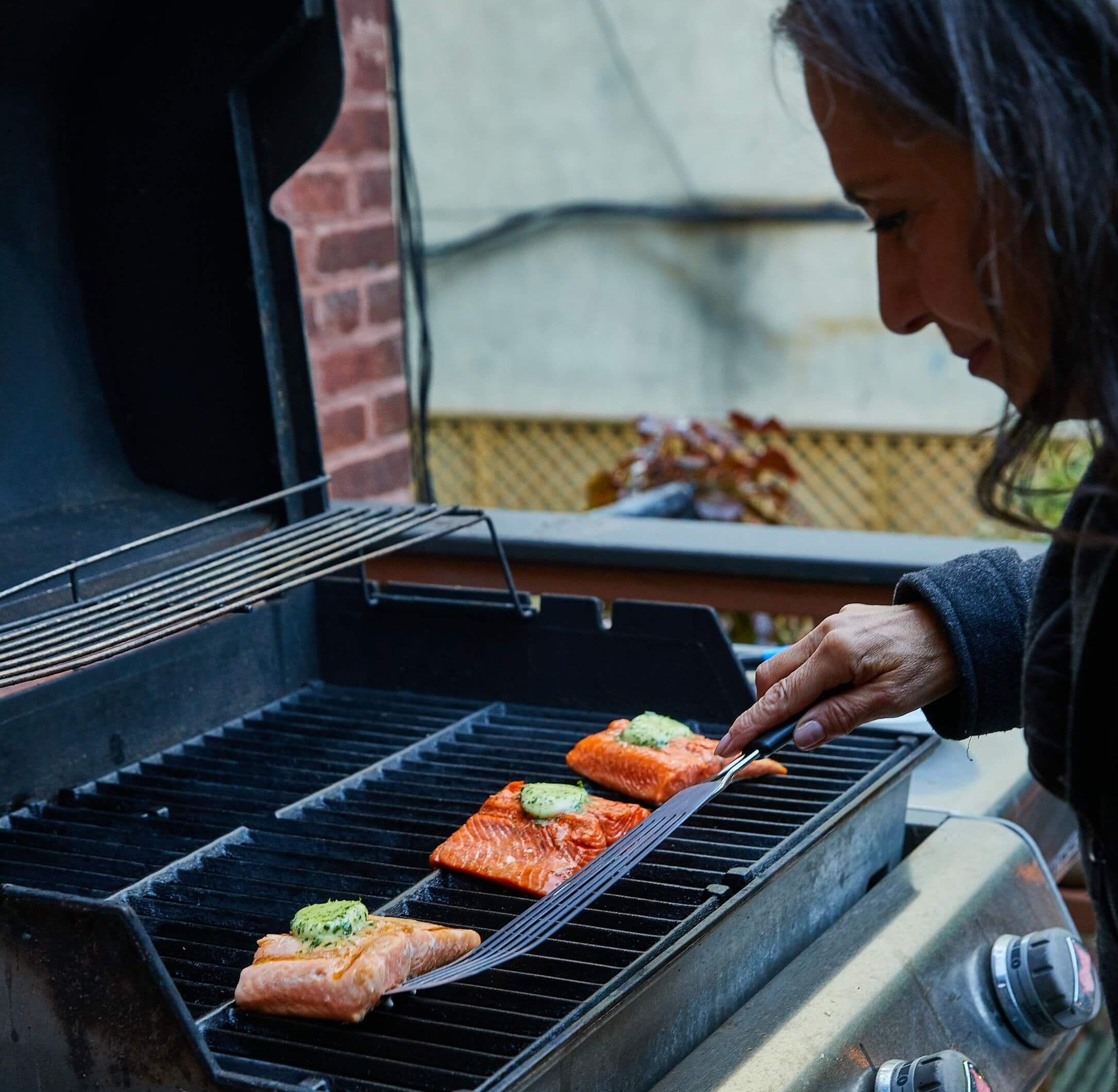 Preheated and oiled, now we’re finally ready to get cooking. Rub the fish all over with oil and season it as desired. If you like crispy skin salmon or sablefish, add it to the grill, skin-side down and cook it without moving until the skin is golden brown. If the fish is dry and the grates are oiled, the fish will release from the grill once it’s browned enough. Don’t move the fillet prematurely or the skin may stick. Be patient! Use tongs to gently lift one corner to check for readiness, then carefully slide a spatula underneath the fillet. Lightly oil the top of the fillet before flipping, then cook until the fish is done to your liking. Depending on the strength of your grill and the size of the flames, you may need to lower the temperature to avoid the skin from burning.