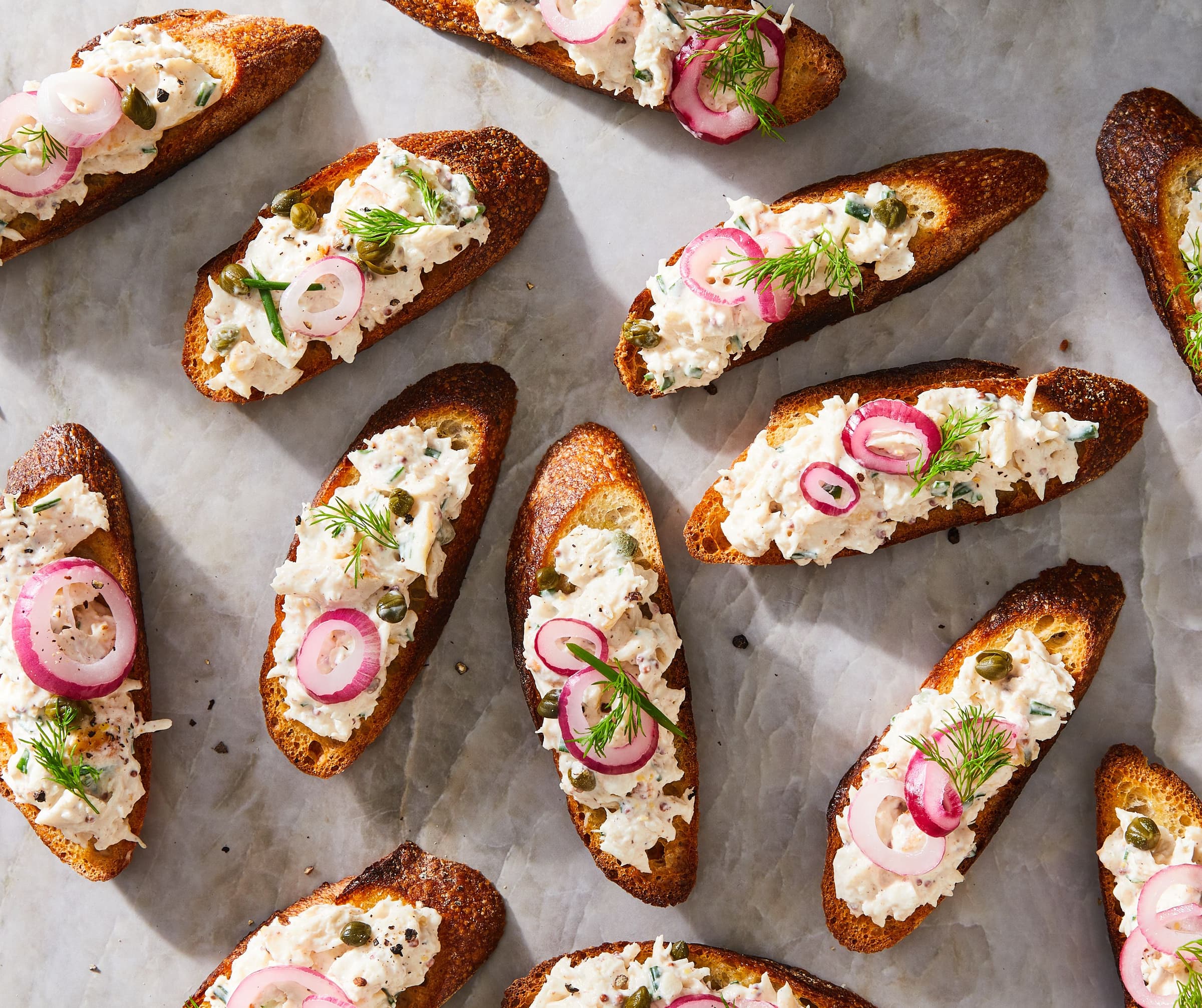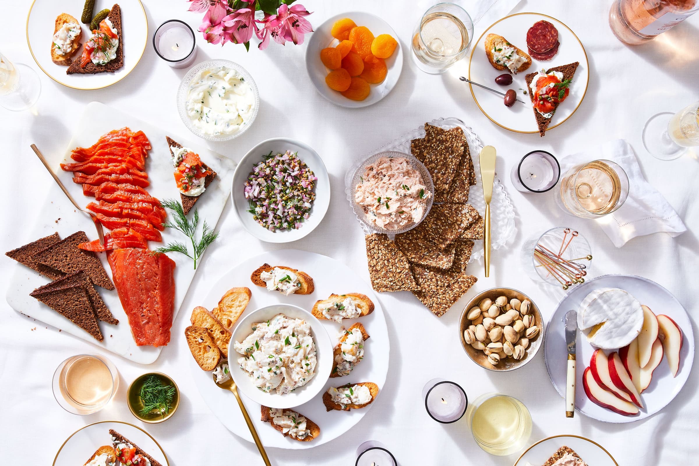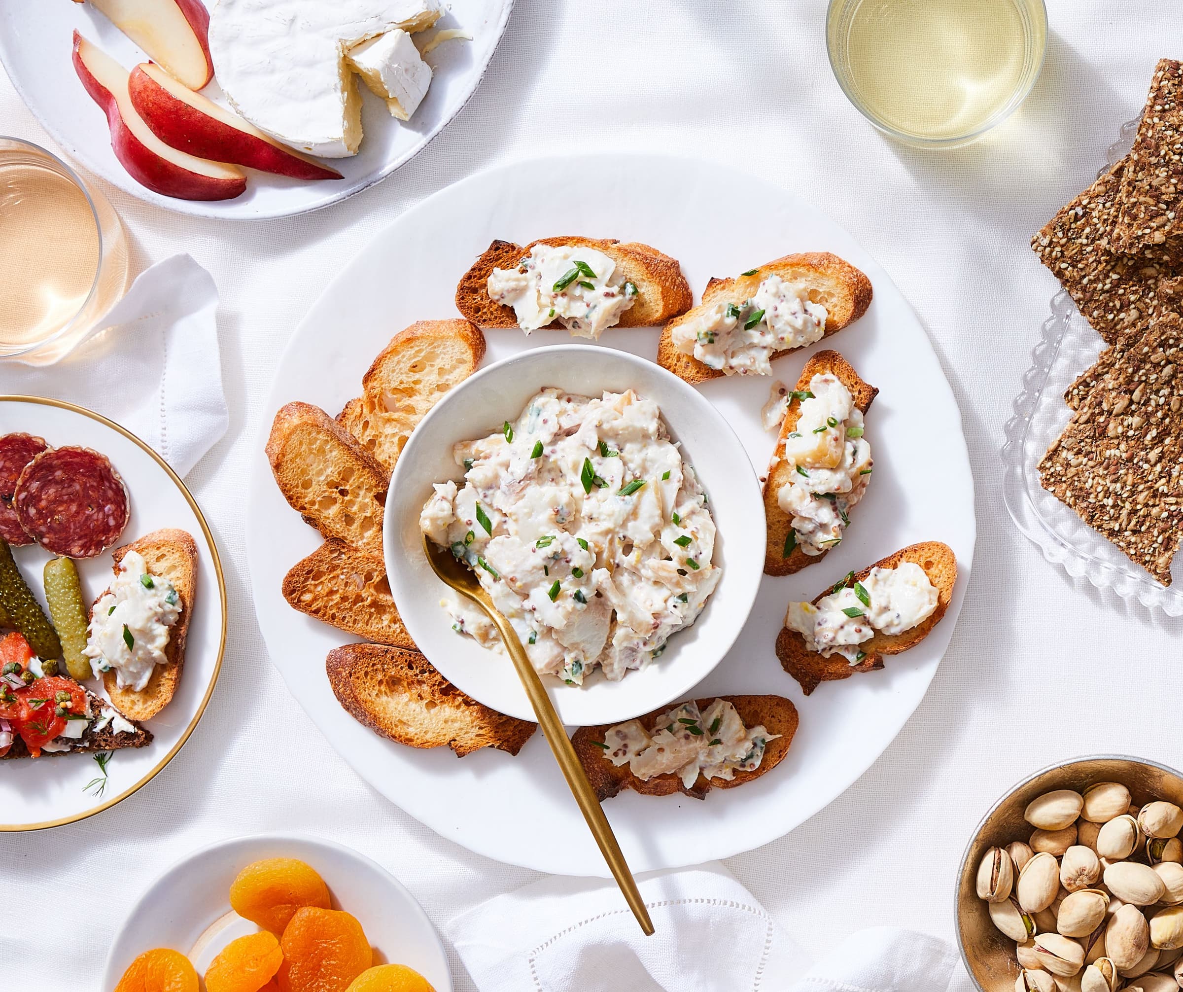 As part of a seafood charcuterie board (“seacuterie”), serve an array of warm spreads and dips and cured or raw seafood, and invite guest participation. Set out cute cocktail plates, napkins, and spreaders. And accompany the board with a variety of breads, crackers, nuts, and fruit. All can be made ahead of time and heated, sliced, or assembled just before serving.