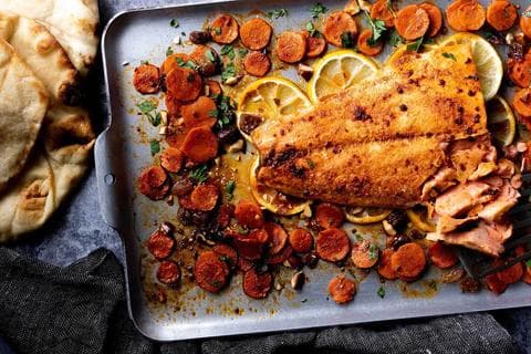 For pescatarian guests — and everyone else — why not add a sheet pan of salmon and your favorite fall veggies to your Thanksgiving menu? The beauty is that it can be roasted while the turkey rests. Because Brussels sprouts, potatoes, and red onions tend to be a bit drier than other vegetables, you can safely crowd the pan to feed your crowd.
