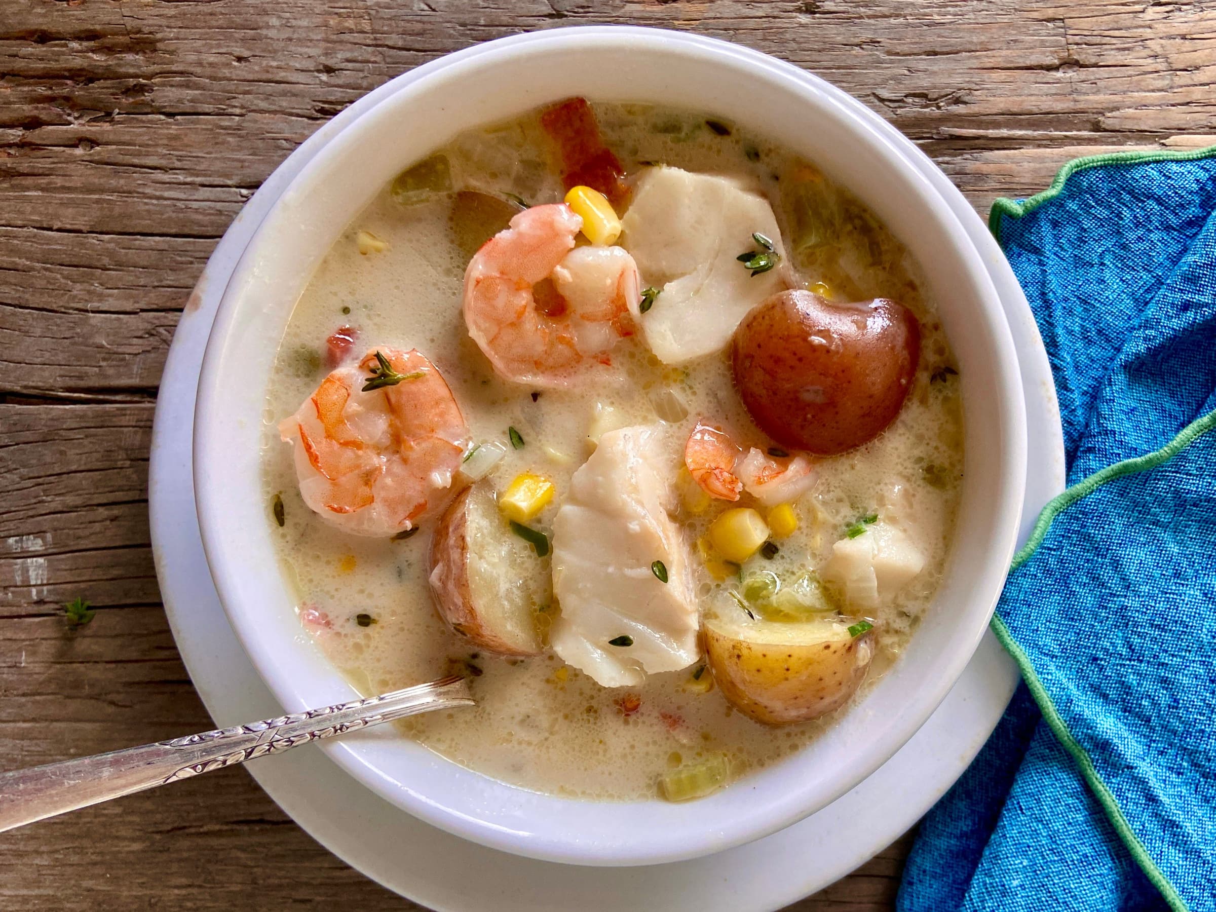 To commemorate the first Thanksgiving in Plymouth, Massachusetts, serve this creamy New England Seafood and Corn Chowder. To feed a crowd, double the recipe and prepare the soup base (potatoes included) ahead of time. Reheat and add the corn and seafood just before serving.