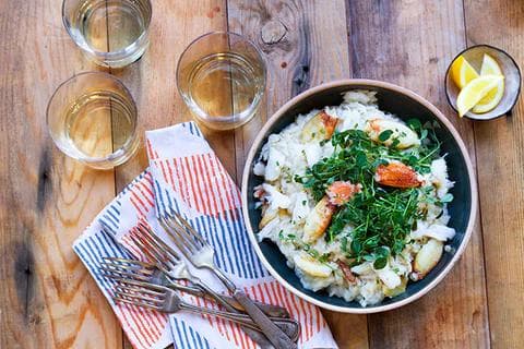 Tender pea shoots are worth seeking for this recipe, but any fresh micro greens or even baby arugula would be delicious with this rich, creamy Dungeness crab risotto. We recommend serving it with roasted or steamed asparagus alongside for added springtime goodness.