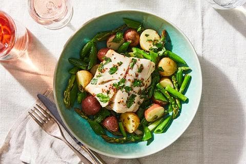 A quick sauté and toss in an herby vinaigrette renders the spring vegetables in this sablefish (black cod) recipe delightfully crunchy and flavorful—a perfect welcome to spring. Feel free to sub in any vegetables you like, but keep an eye out for what’s in season at your local farmers’ market or produce stand, as those will have the best flavor.