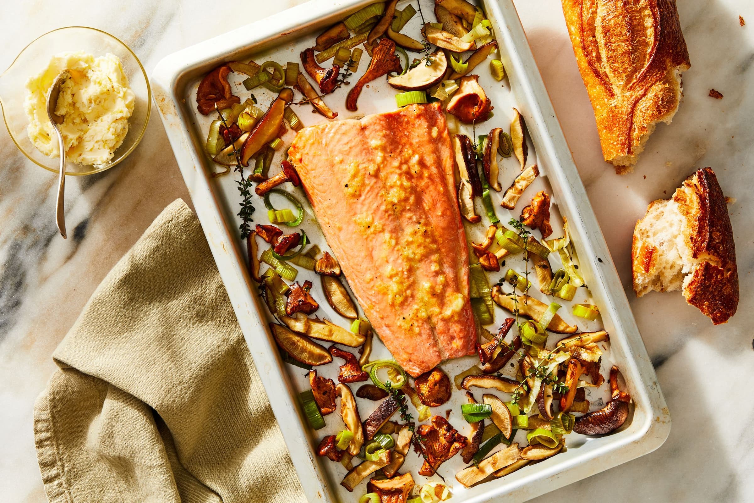 All hail the mighty leek! In this simple sheet-pan recipe, aromatic leeks and earthy wild mushrooms make the perfect base for fresh salmon. For seasoned mushroom hunters, this recipe may be the perfect opportunity to don your foraging basket. Otherwise, play it safe with the mushrooms at your local market or farm stand—they’ll be just as delicious.