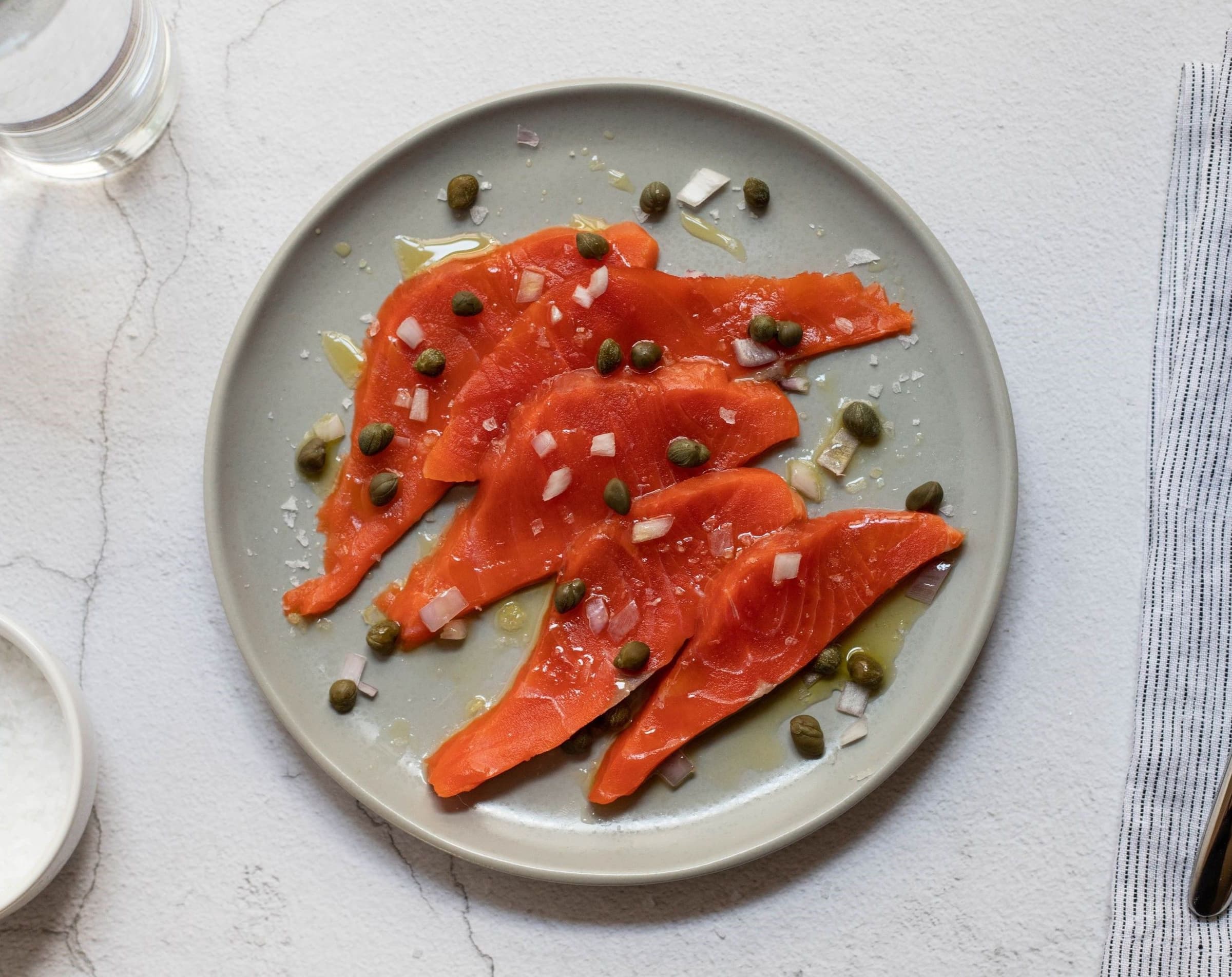 Finally, if you’re making carpaccio, begin by arranging the thinly sliced fish on a chilled plate. Then artfully arrange your aromatics so that each bite of fish includes a little of each.