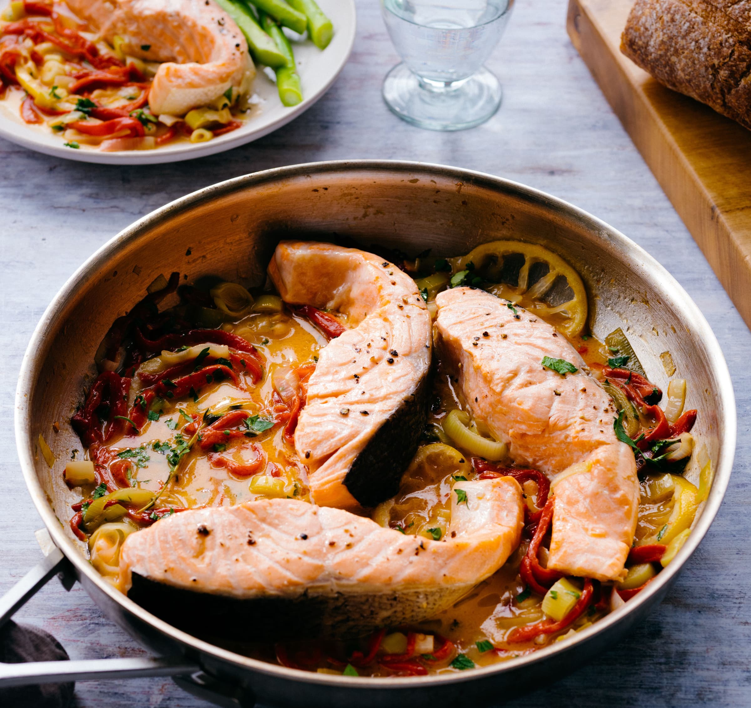 - Roasted piquillo peppers from the Navarre region in Spain lend a slightly smoky-sweet flavor and are worth seeking out, but roasted red bell peppers also work well in this Wine-Poached Salmon with Peppers and Leeks.