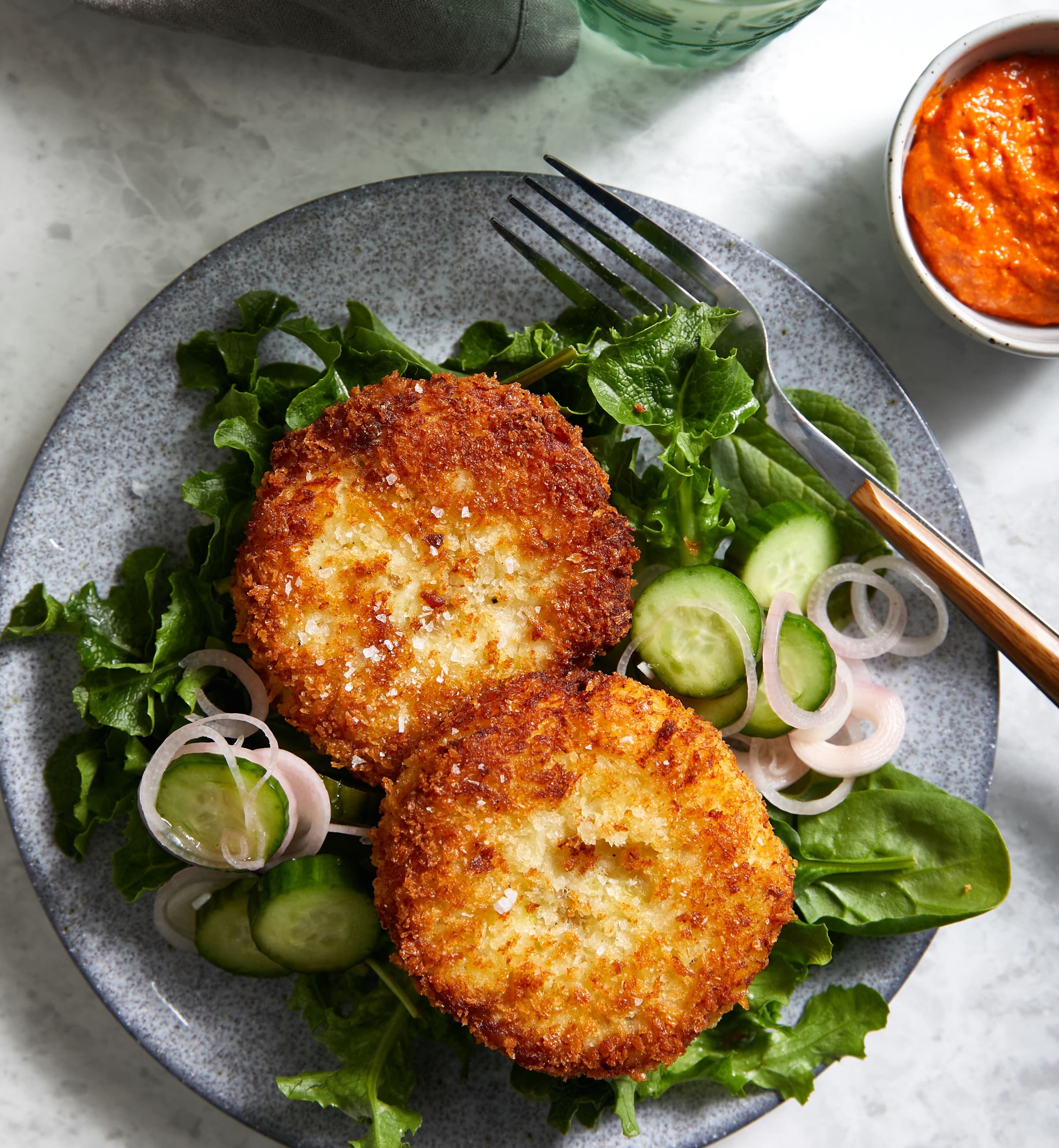 - Pan-Fried Fish Cakes with Romesco Sauce Crispy fried fish cakes are served with a traditional Catalan sauce called romesco, which typically includes roasted peppers and tomatoes, toasted bread, almonds, and plenty of fruity olive oil.