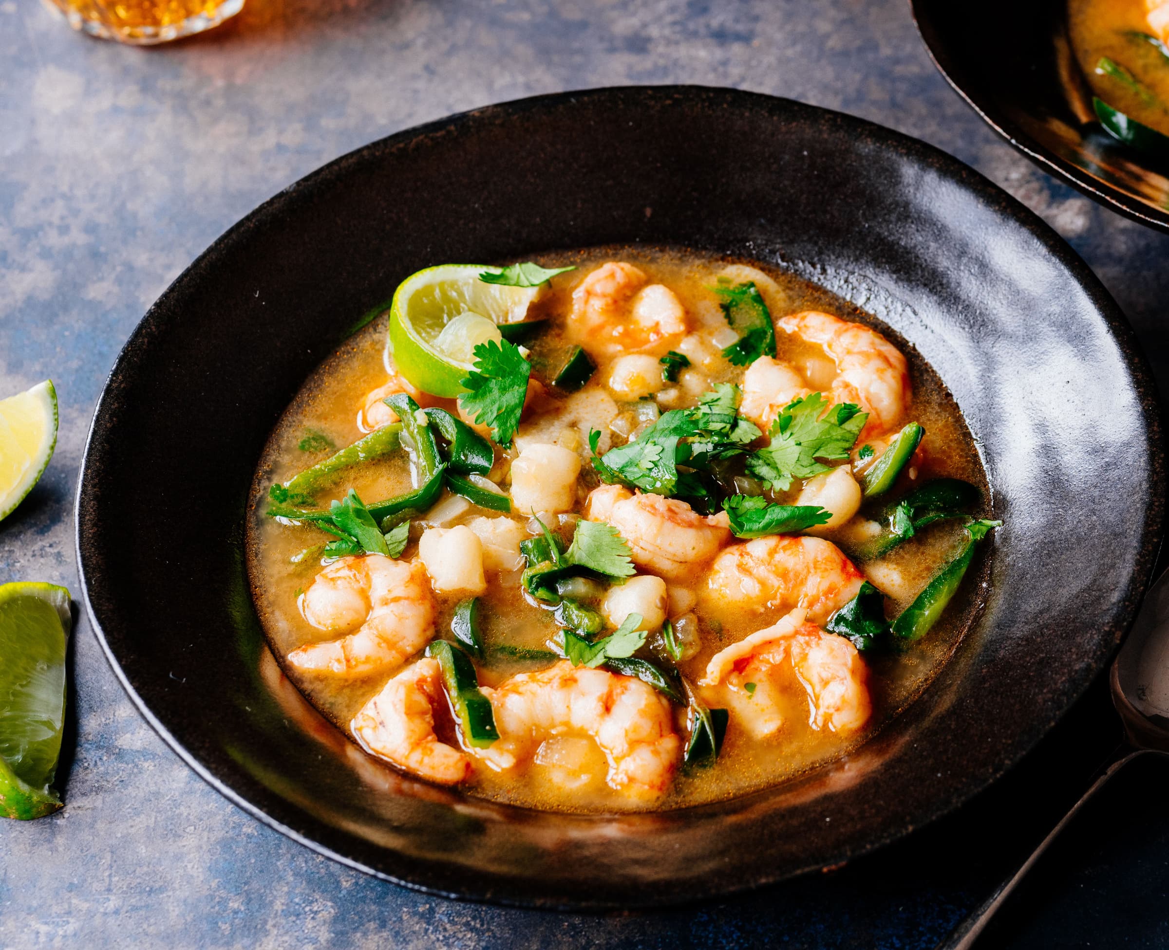 - Shrimp Tortilla Soup This light but hearty sopa uses homemade shrimp stock as a base and gets plenty of fruity and slightly bitter flavor from poblano chiles. Poblanos can vary in heat, so taste before adding and adjust to suit your preferences. Having a sweet bell pepper on hand as a heat-free substitute is a good kid-friendly dinnertime strategy.