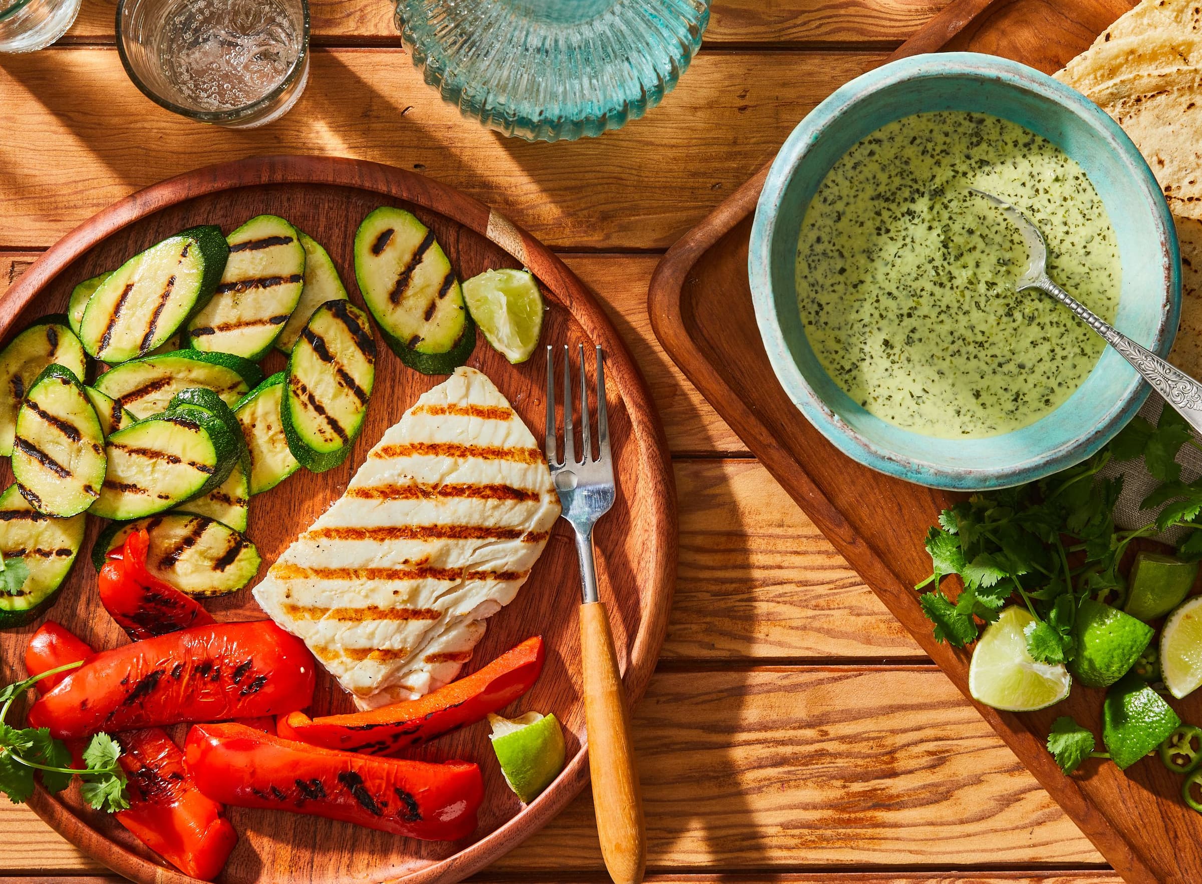 - Grilled Halibut and Vegetables with Salsa Verde A tart and fiery green salsa made with jalapeño and cilantro dresses up simple grilled fish, zucchini, and bell peppers.
