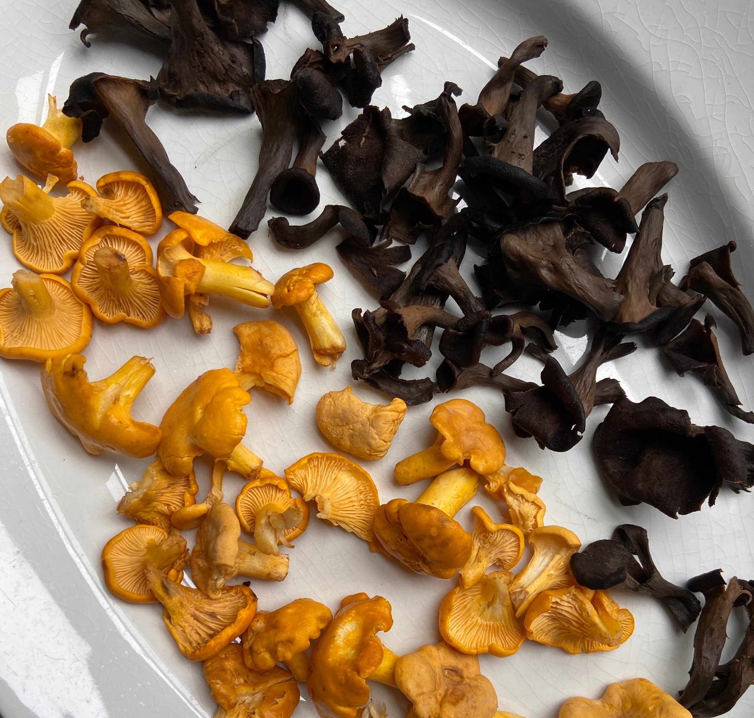 Late summer and early fall is peak mushroom season in my part of Maine and while I’m not an expert, there are several local varieties — chanterelles, black trumpets, chicken of the woods, and oyster mushrooms — that I can easily (and safely) identify. I know enough to carry a paper bag when hiking or wear a baggy t-shirt when running to hold any mushrooms I come across. This year, which has been rainy and somewhat cool, has been stellar for foraging and has inspired lots of great meals. One in particular was Seared Halibut with Wild Mushrooms and Bacon, crusty sourdough bread, and a fresh tomato salad. The mushrooms were foraged, the bacon came from a local farm, I baked the bread, and I grew the tomatoes. The halibut was from Alaska (of course), but everything else was wild or local or both and it gave me immense satisfaction to know that I had a part in so many aspects of that meal.