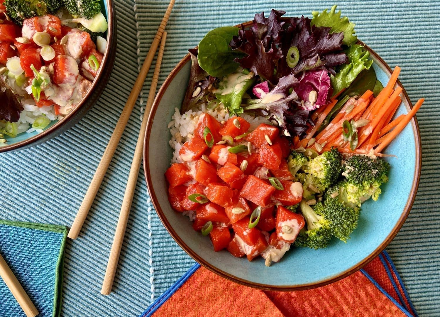 Hawaiian-inspired, poke bowls are endlessly customizable. Marinate diced tuna with tamari, sesame oil, ginger, and scallions. Pile it over rice or greens, and garnish with fresh veggies and spicy wasabi mayo.