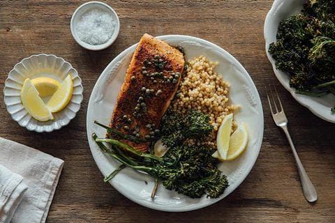 Holidays scream decadence, but our Brown Butter Caper Salmon with Pearl Couscous and Roasted Broccolini is the best of both worlds for those on a health kick. Don’t balk at the title: the recipe calls for a mere 2 tablespoons of butter (that’s only 1 per person), which adds a major boost of flavor for a modest calorie price tag. With pearl couscous and roasted vegetables, it’s an extravagance you can feel good about.