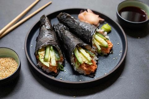 Don’t just delight in eating dinner —there’s making it, too. These Spicy Salmon and Avocado Hand Rolls (aka temaki) are great for a fun and hands-on shared activity.