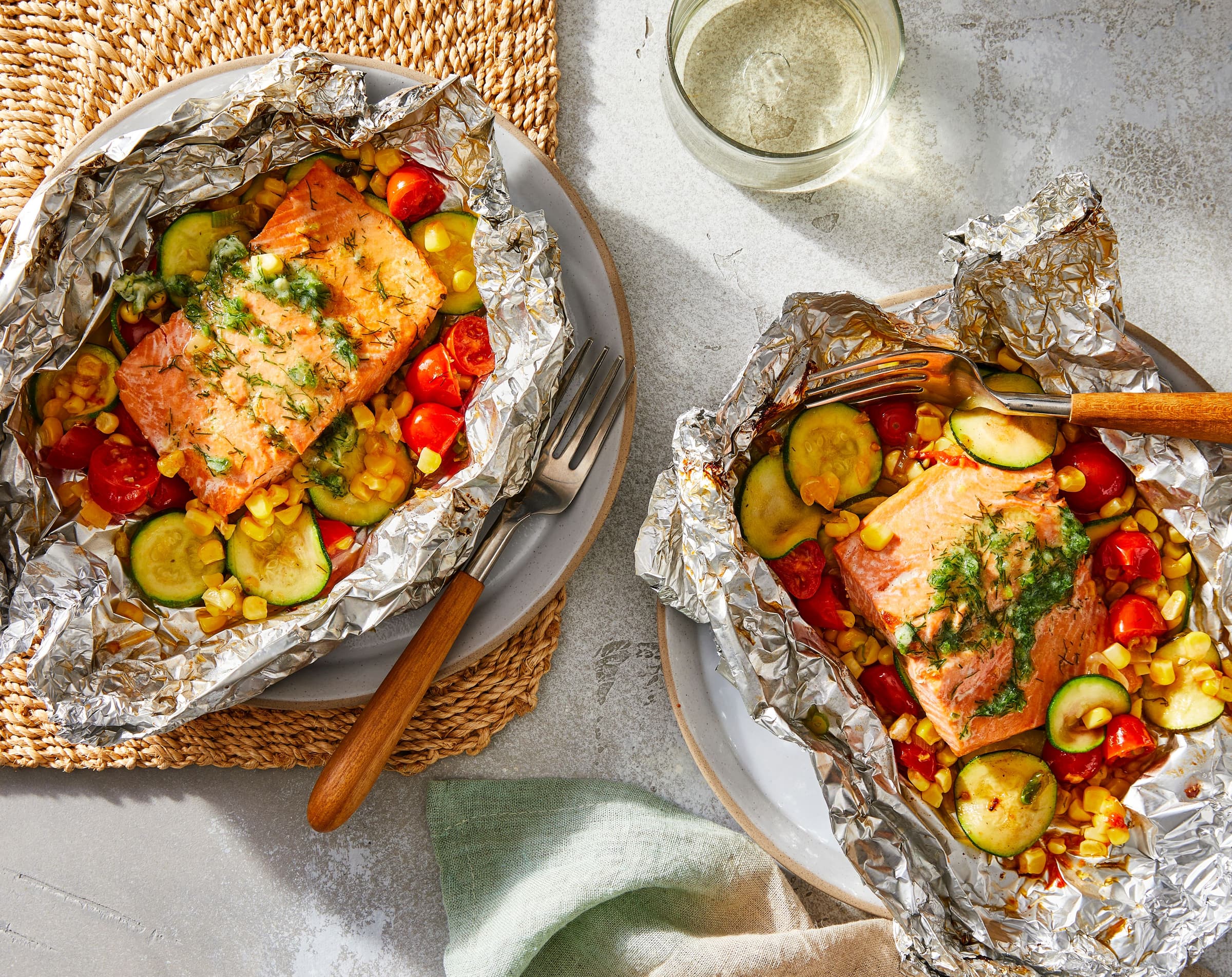Steam-baking rich salmon fillets and tender vegetables in foil is a healthy and delicious way to infuse flavor into the fish — and a handy way to make a complete meal. This recipe uses classic summer veggies like peak of season cherry tomatoes, sweet corn, and abundant zucchini. But feel free to switch it up with sliced okra, sweet peppers, and eggplant.