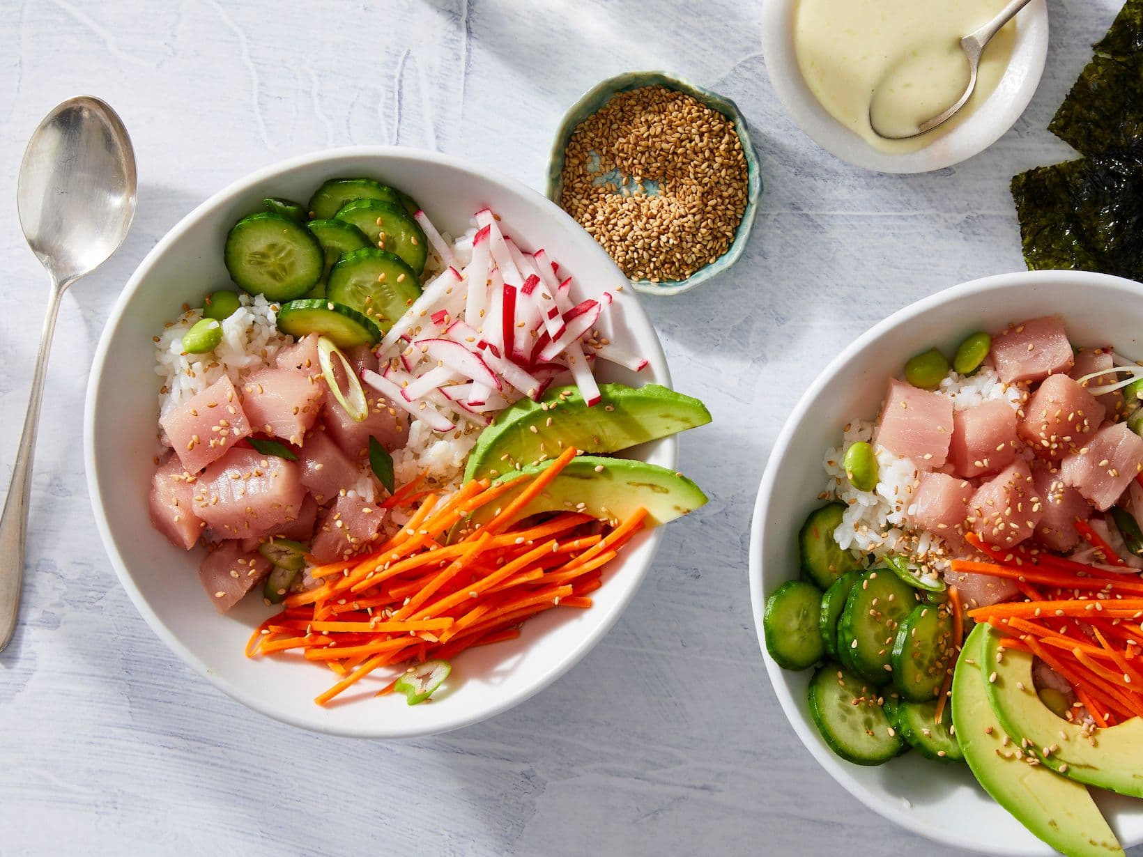 Poke, a delicious Hawaiian export, may seem high maintenance but is actually very doable at home. As with any rice or grain bowl, this recipe is customizable — so you only have to do as much veggie prep as you want. Let our delicious albacore do the heavy lifting.