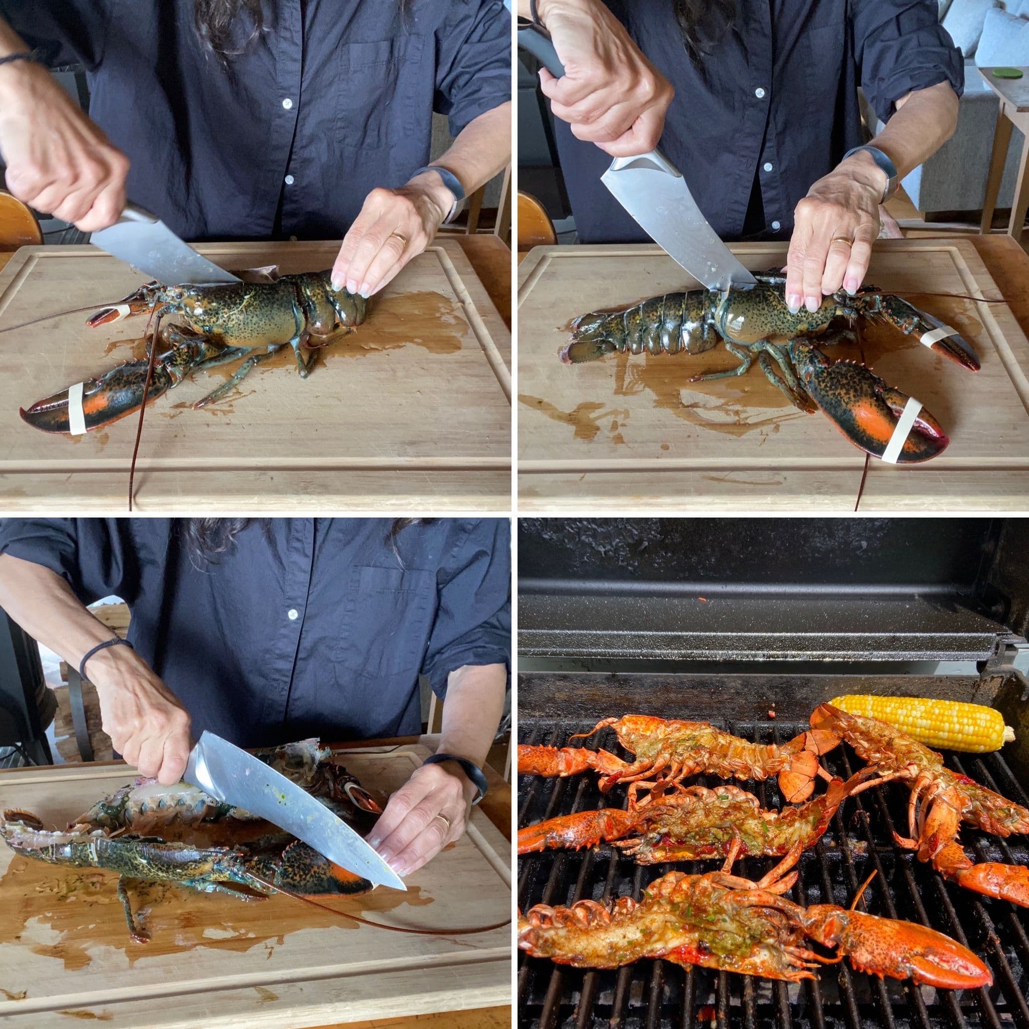 Once the unpleasantness is out of the way and the lobsters are butterflied, I light the grill and make a flavorful oil to baste the exposed meat during cooking. The combination of olive oil, garlic, and chopped fresh herbs is an all-around workhorse for grilling just about everything. Try this combo: ½ cup olive oil, 2 teaspoons smoked paprika or a pinch of chili flakes, 2 grated garlic cloves, 2 tablespoons mixed chopped fresh herbs such as parsley, rosemary, thyme, and chives and a pinch of salt. Use this link for a printable version of the recipe.