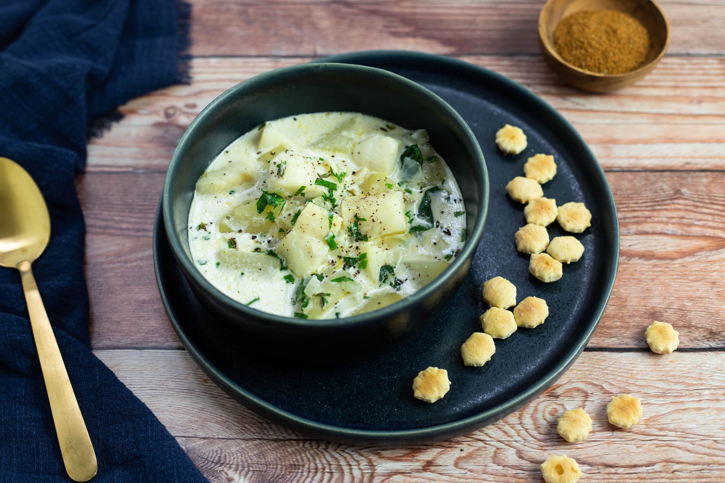 This super satisfying, all-in-one, one-pot chowder combines meaty white fish, hearty potatoes, and baby spinach, flavored with Old Bay Seafood seasoning blend and comes together pretty quickly. It freezes well in single servings and is best rewarmed in the microwave or stovetop at a light simmer.