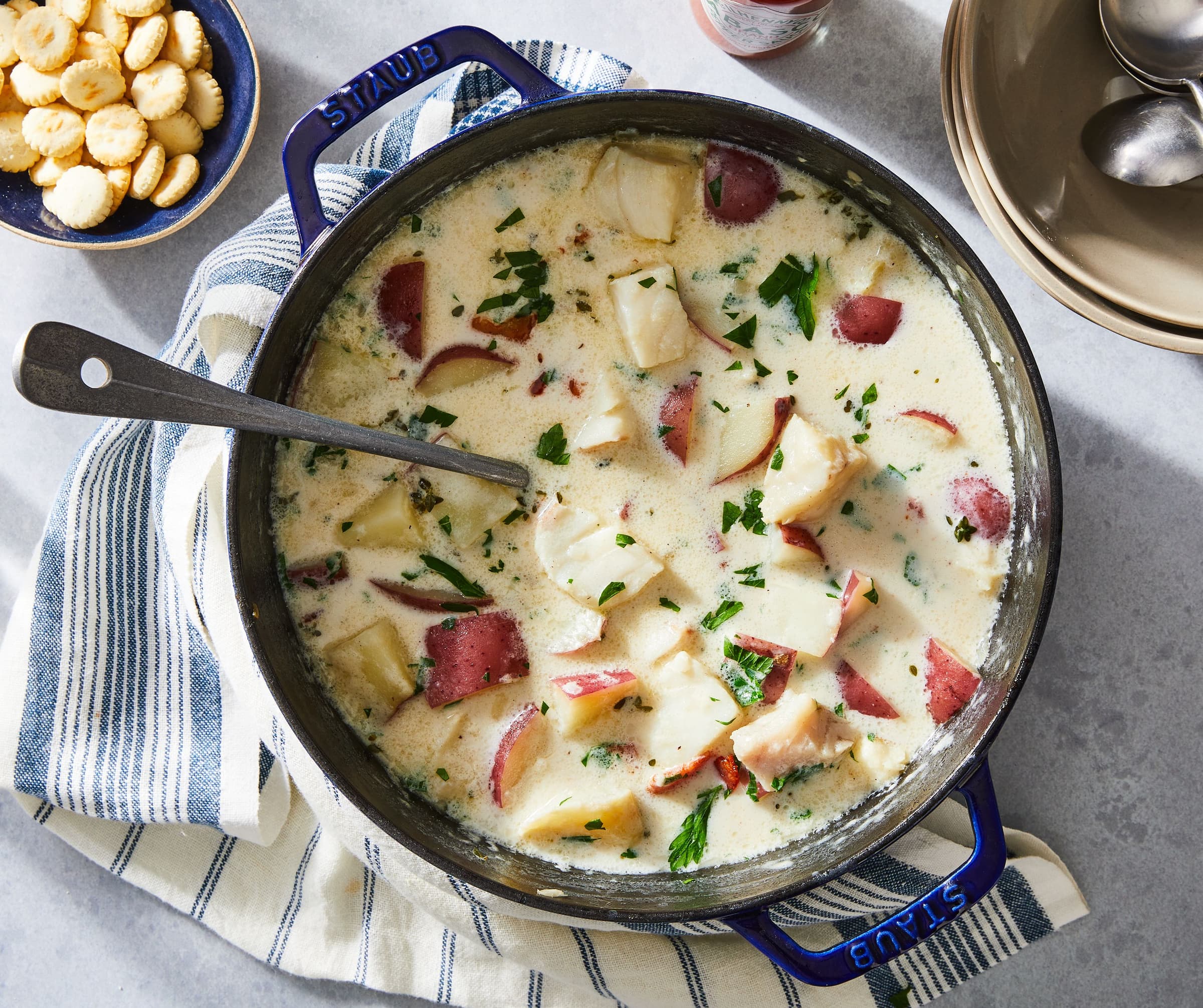 New England fish chowder is typically made with haddock—similar in taste and texture to Pacific cod and rockfish—and not much else other than bacon, cream, clam juice, and potatoes. In the Yankee tradition, this chowder is pared down to its essentials, except for the thyme and parsley which may make a true New Englander chafe at the extravagance.