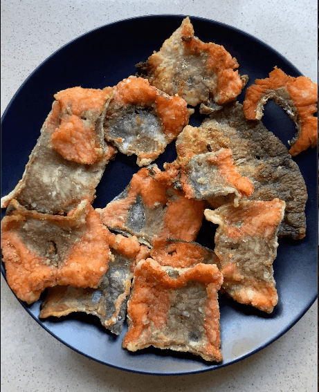 The salmon offcuts tend to be from tail pieces which, fortunately, include very few pin bones. They do still have the skin on and it can be a little time consuming and finicky to remove the skin from so many small pieces. But, in the true spirit of upcycling — making something out of nothing — it is well worth the effort if the end result is crispy, crunchy salmon cracklings. So sharpen your knives, secure your cutting boards, and zen out on the skinning process. Then dust the salmon skin with a little cornstarch and shallow-fry until golden and crispy! Here’s the best part: don’t worry if you leave a little extra meat on the skin. It won’t go to waste.