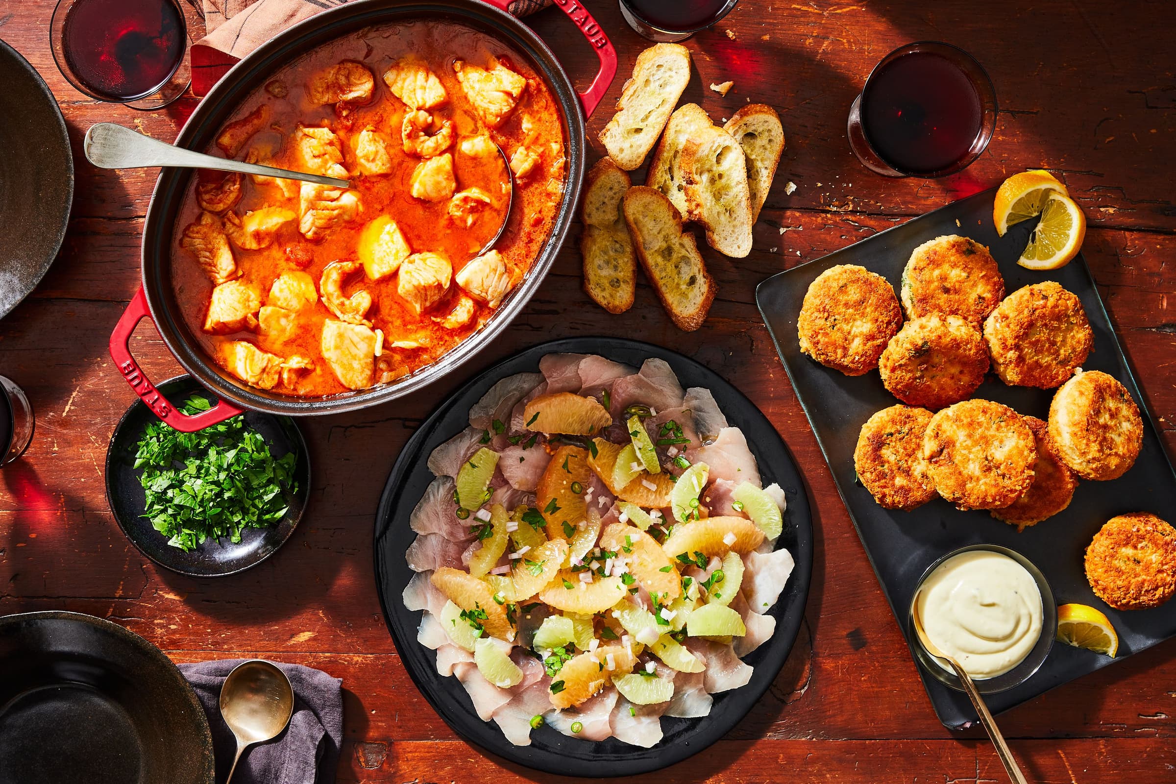 For maximum delivery with minimal effort, nothing beats a giant pot of simmering seafood stew. Italian Seafood Stew, (cioppino), is redolent of tomatoes, fennel, garlic, shrimp, and white fish, and can be made well ahead, adding the seafood minutes before guests are served. Likewise with Shrimp and Andouille Gumbo: Make the gumbo base the day before (it gets better the next day), then reheat it and add the shrimp at dinnertime.