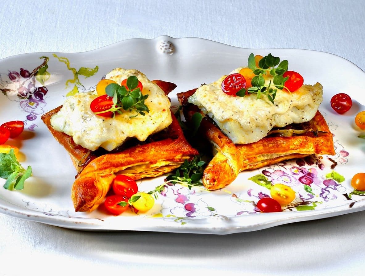 TO PLATE Gently warm up the pastry kites. Fill with warm mushroom onion sauté. Place halibut on top. Garnish with herb sprigs or microgreens and cherry tomatoes.