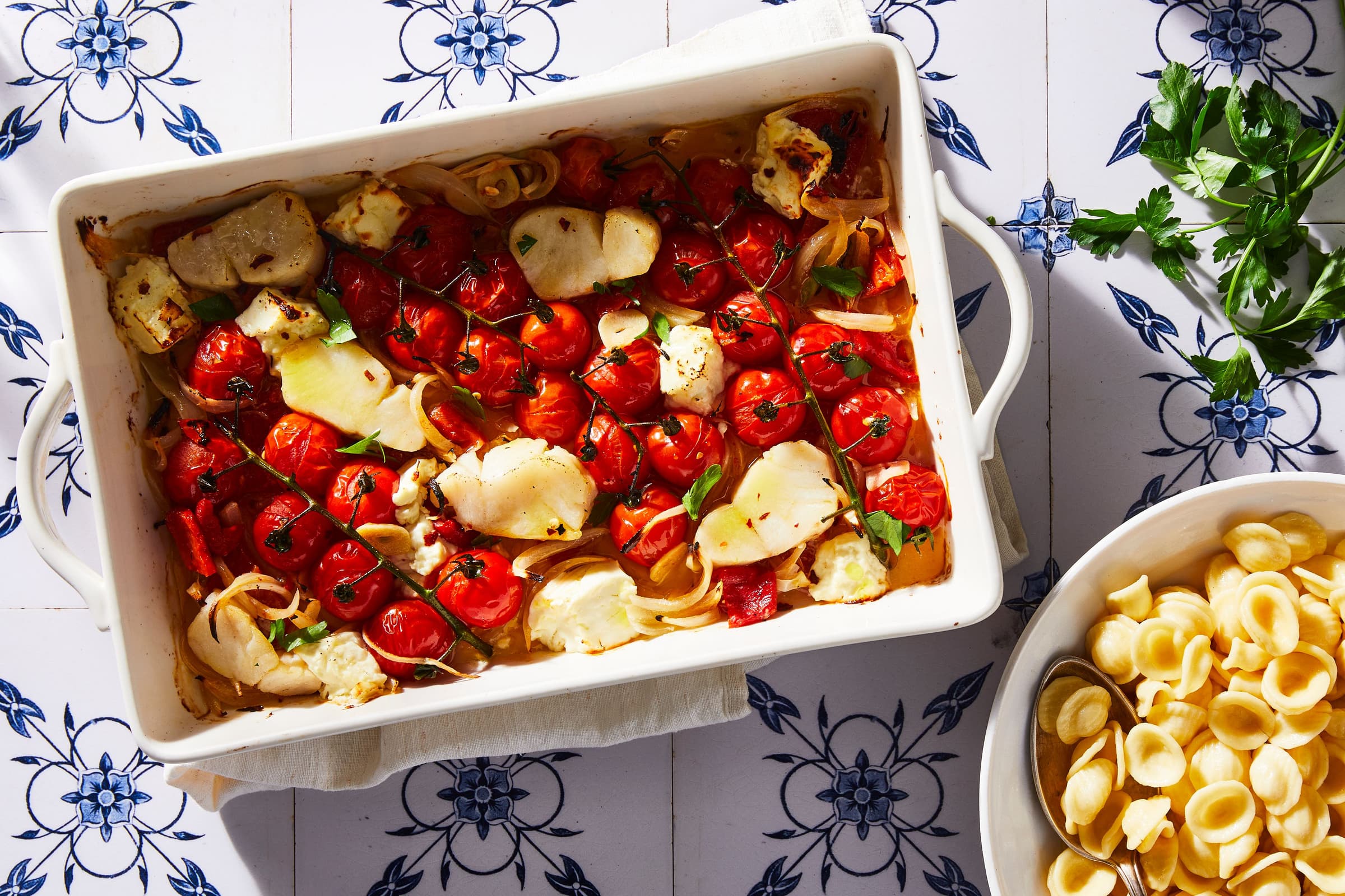 Position a rack in the upper third of the oven and preheat to 425°F. Bring a large saucepan of salted water to a boil. In a shallow, ovenproof, 1½-quart baking dish, combine the olive oil, cherry tomatoes, roasted bell pepper, onion, garlic, oregano, and red pepper flakes, tossing to coat.