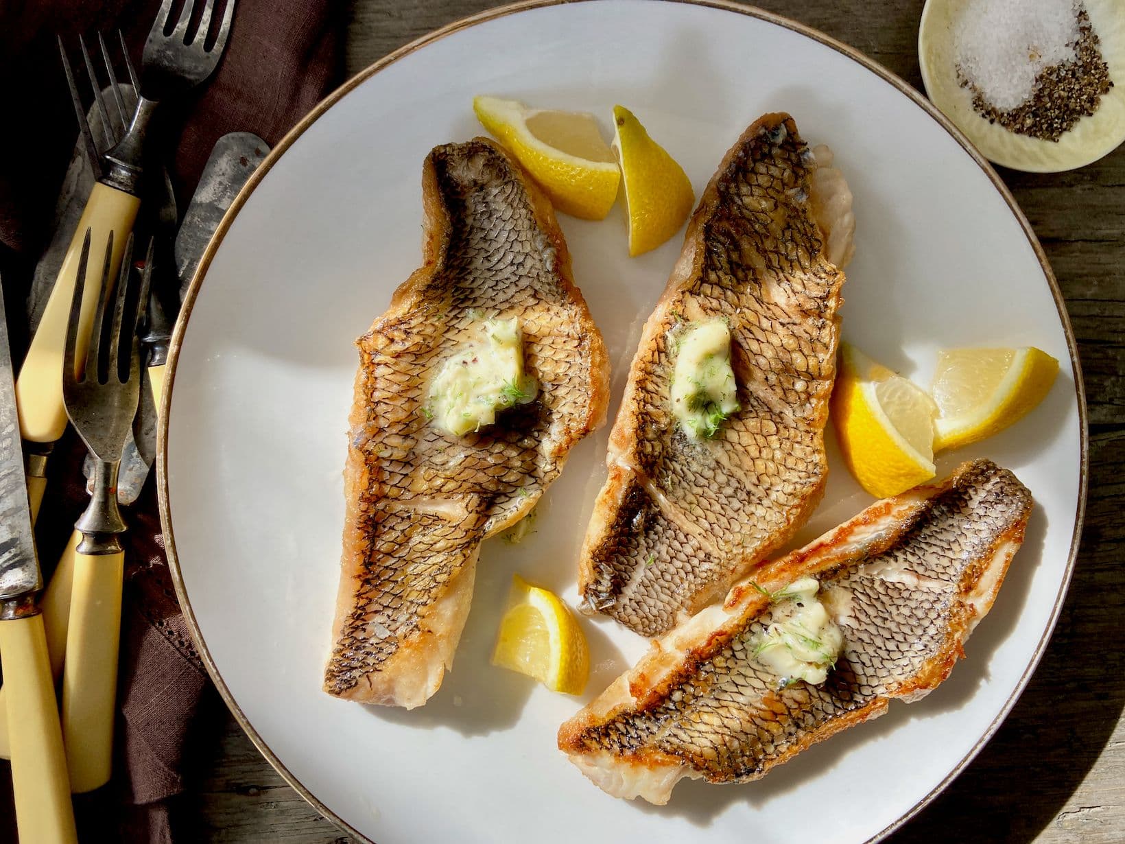Transfer the fish to plates, skin side up, and top with the garlic-herb butter. Sprinkle with flaky sea salt and serve with the lemon wedges alongside.