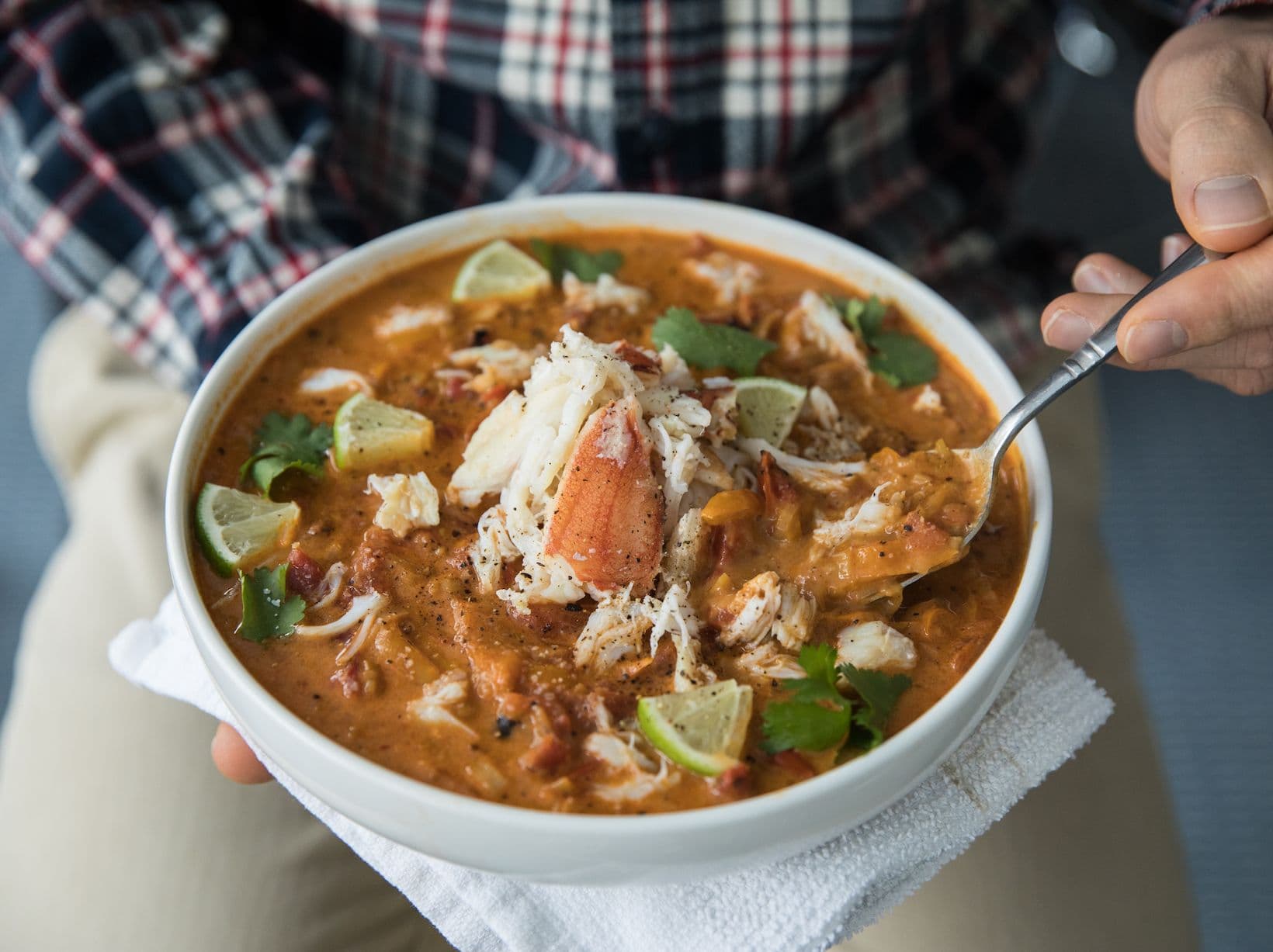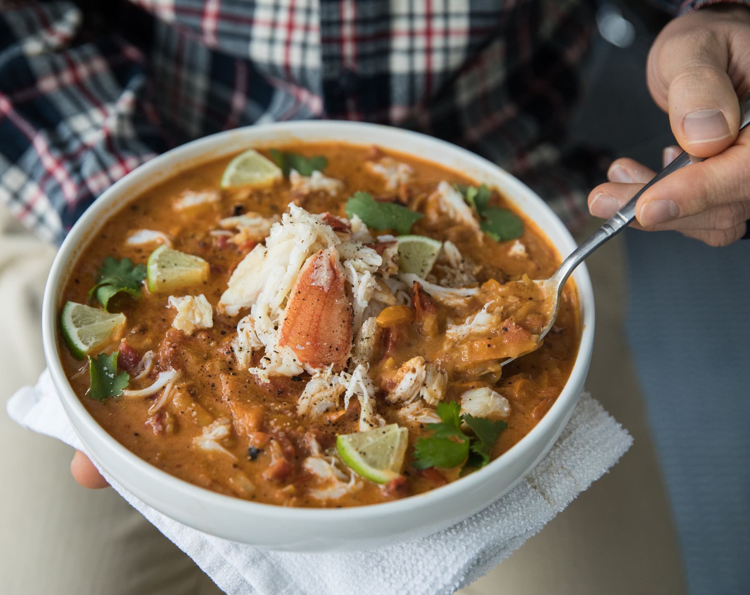 Serve in bowls topped with crab meat, a squeeze of lime, and cilantro. Crusty bread on the side doesn’t hurt either!