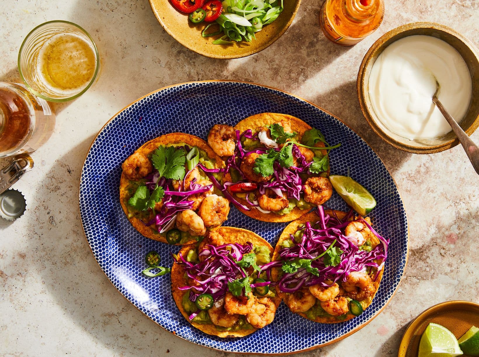 Serve these flavorful tostadas with a crisp lager or zippy albariño to balance the smoky heat and allow the delicate spot shrimp to shine.