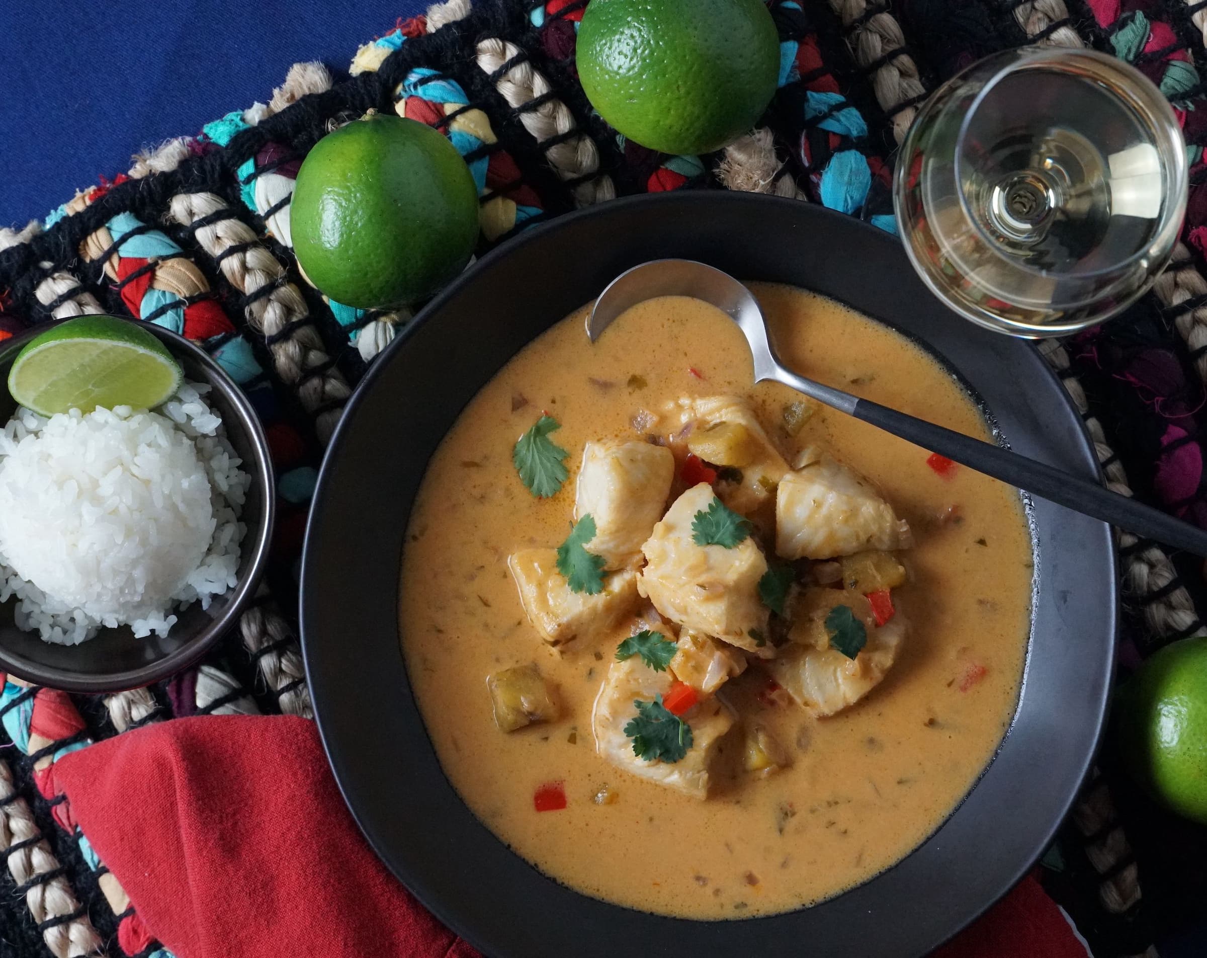 Add the fish and its marinade and ¼ teaspoon salt. Cover and cook, gently stirring occasionally, until the fish is opaque and cooked through, about 4 minutes more. Adjust the seasoning if necessary. Divide between two bowls, garnish with cilantro leaves, and serve with rice and lime wedges.