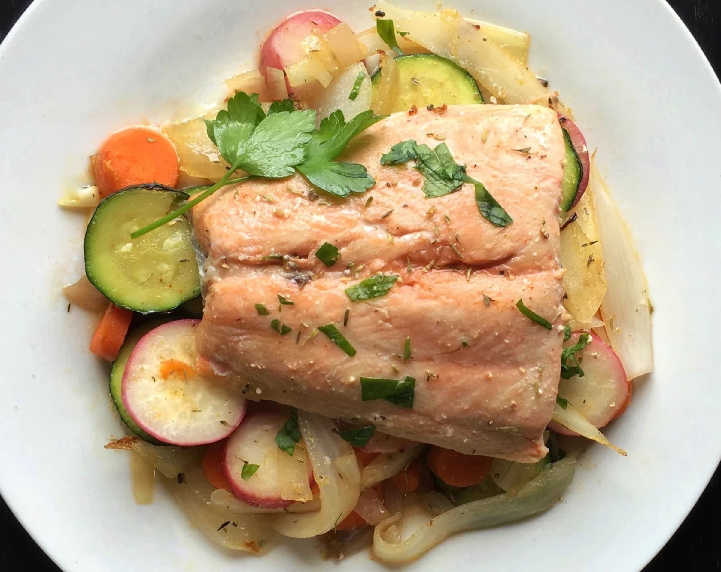 Gently slide veggies and salmon from foil packets onto plates. Serve each with a drizzle of olive oil and a few sprigs of fresh parsley.