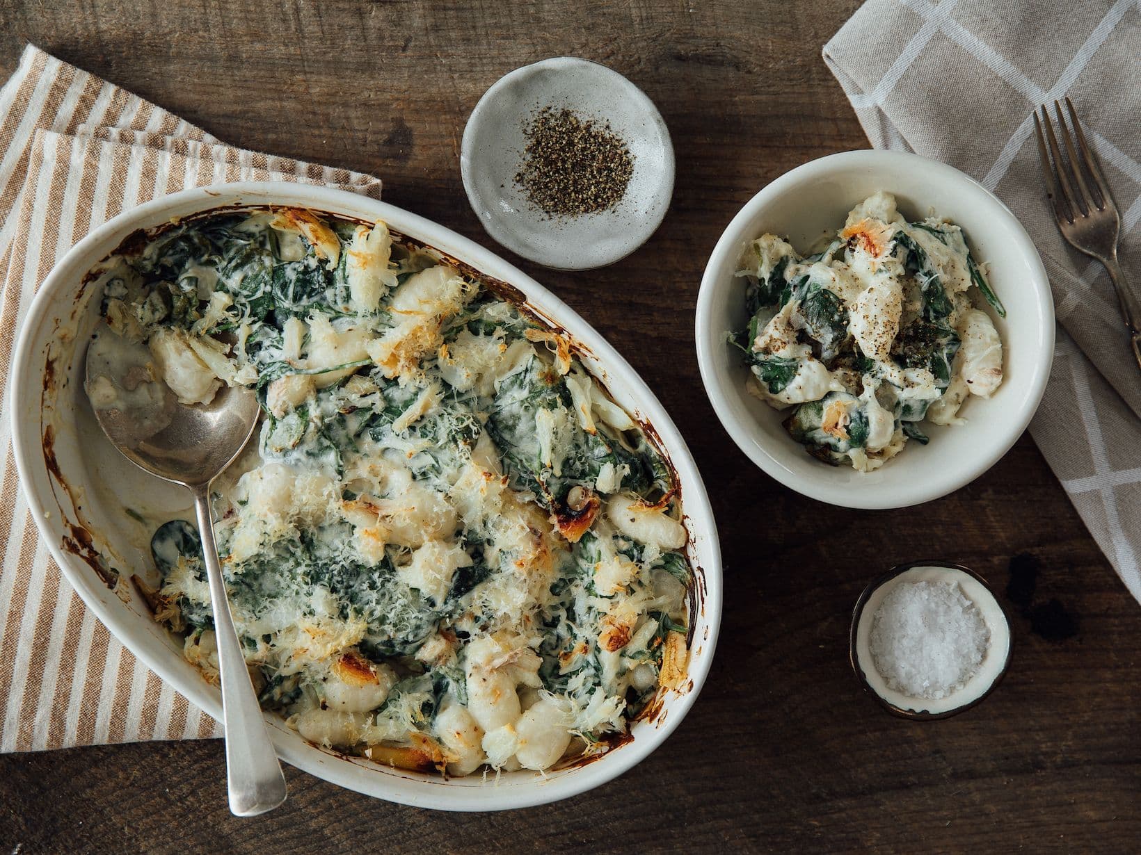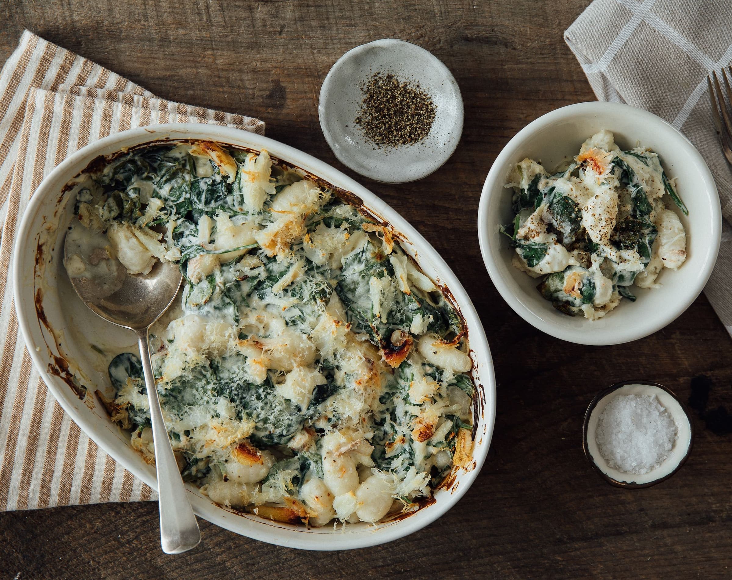 Made with only a handful of ingredients, this crab bake couldn’t be easier to whip together. Loaded with pillowy gnocchi, handfuls of spinach, and hunks of sweet bairdi crab, the substantial dish is perfect for feeding a crowd.