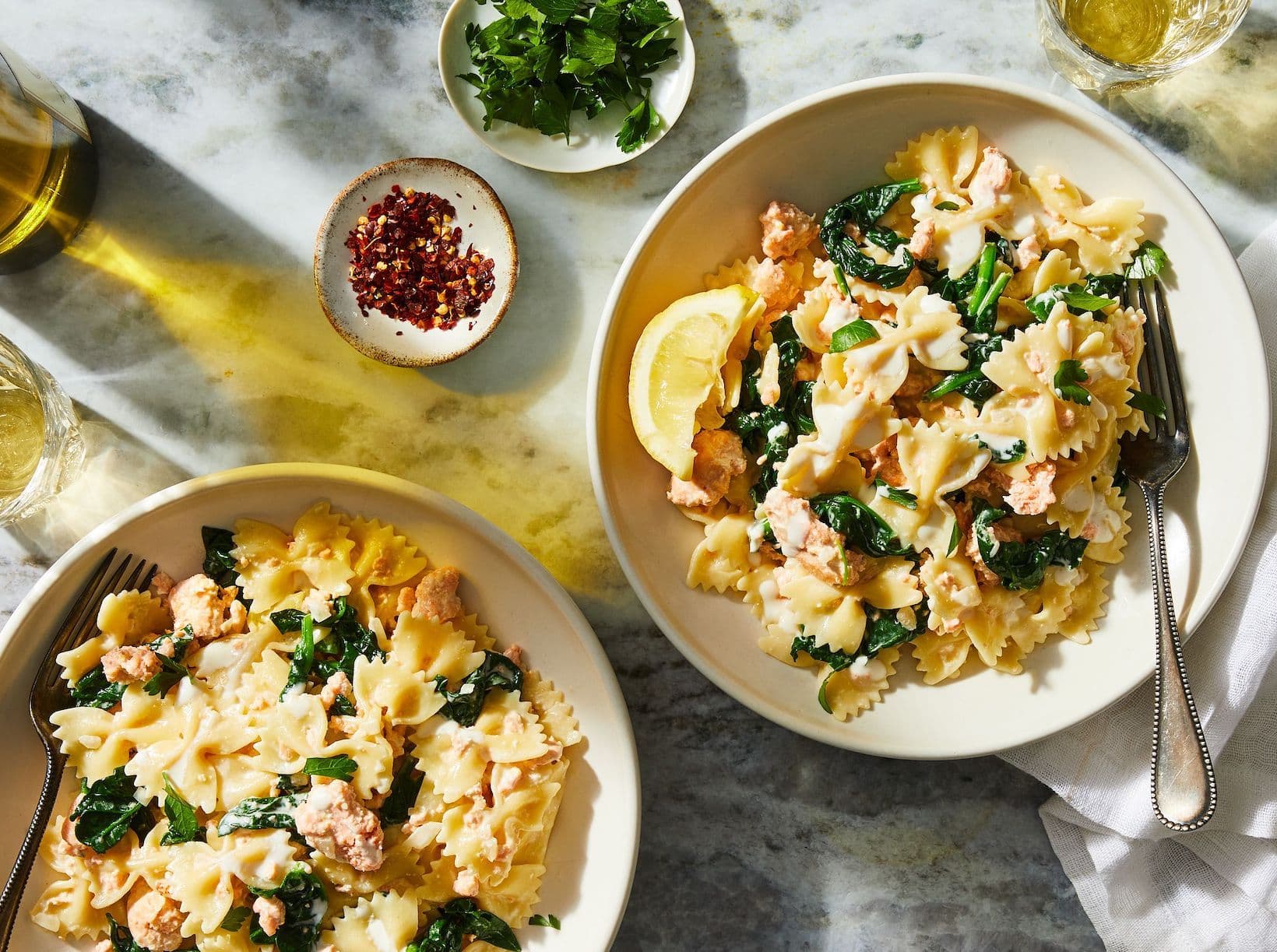 This quick and easy salmon pasta recipe uses ground salmon burger, but the same amount of skinless salmon fillet, cut into small pieces, will work nicely. It is equally great for a weeknight supper as it is for an elegant dinner party and doubles easily for 6 servings. You can build the sauce directly in the pasta pot if you don’t have a gigantic skillet. (Who does?)