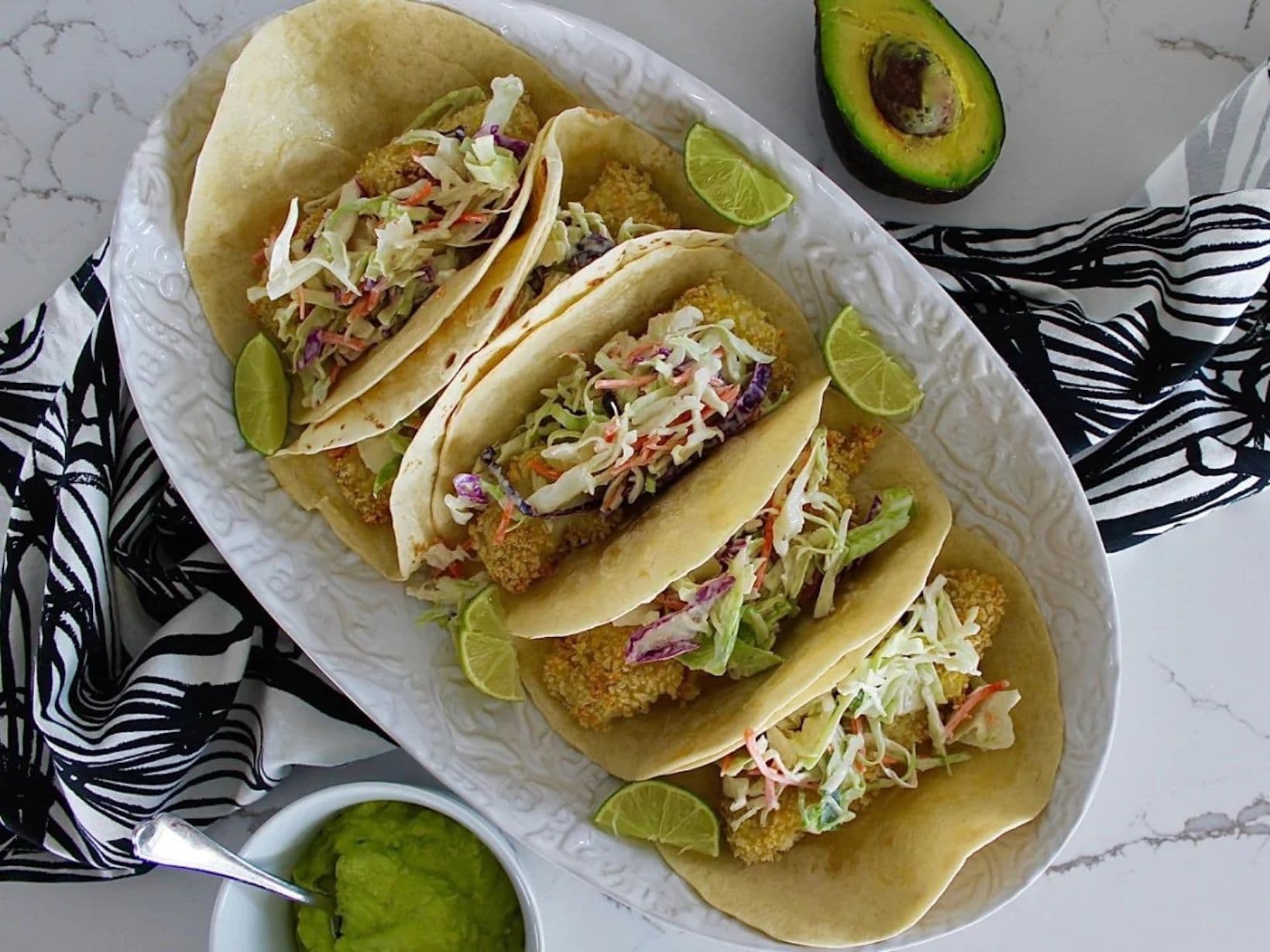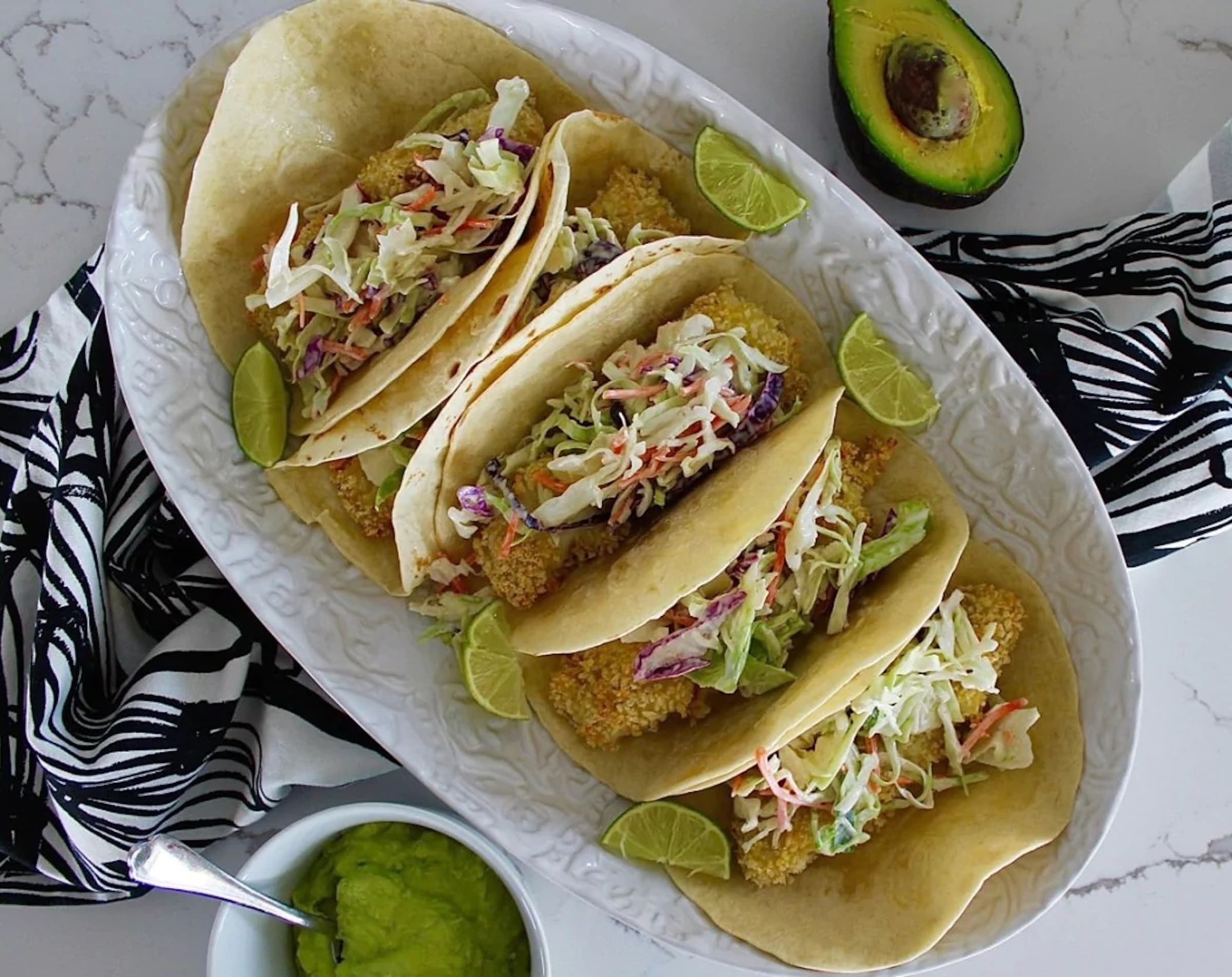 A trifecta of crispy baked fish, cooling avocado crema, and refreshing cabbage lime slaw.