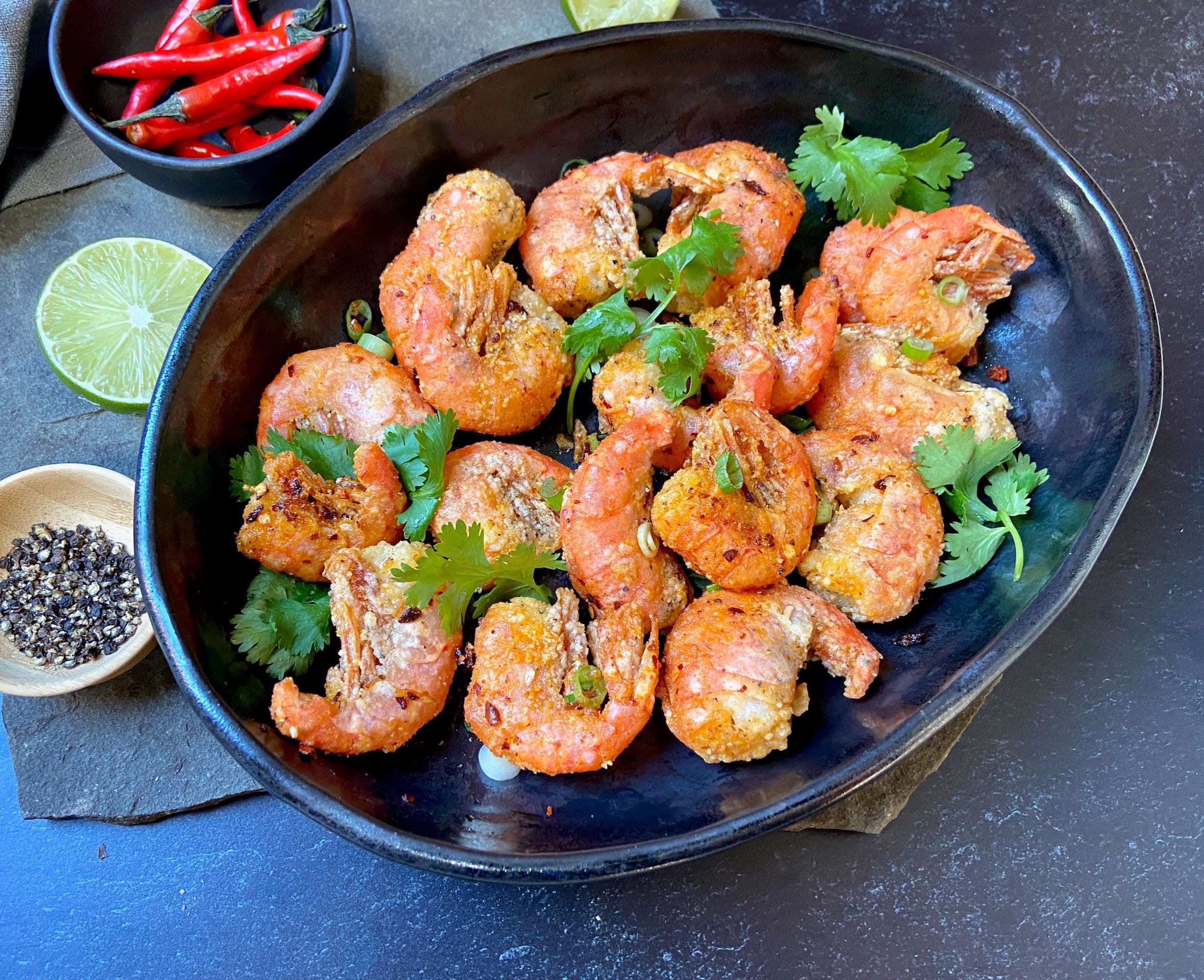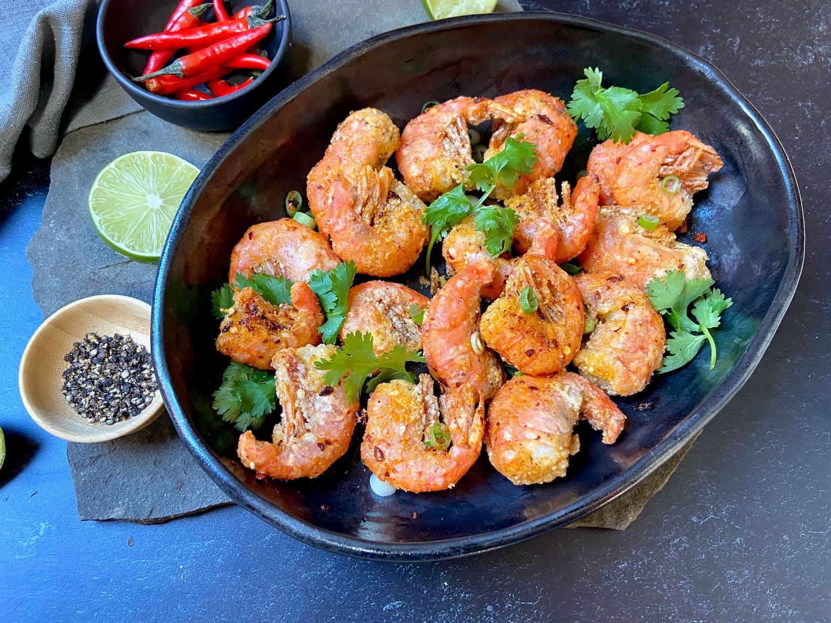 Wild Alaska spot and sidestriped shrimp have delicate shells and swimmerets (legs) which make them ideal for this classic Chinese preparation. The shrimp are tossed with a light dusting of cornstarch, salt, and black pepper which creates a crispy coating when it hits the hot oil.