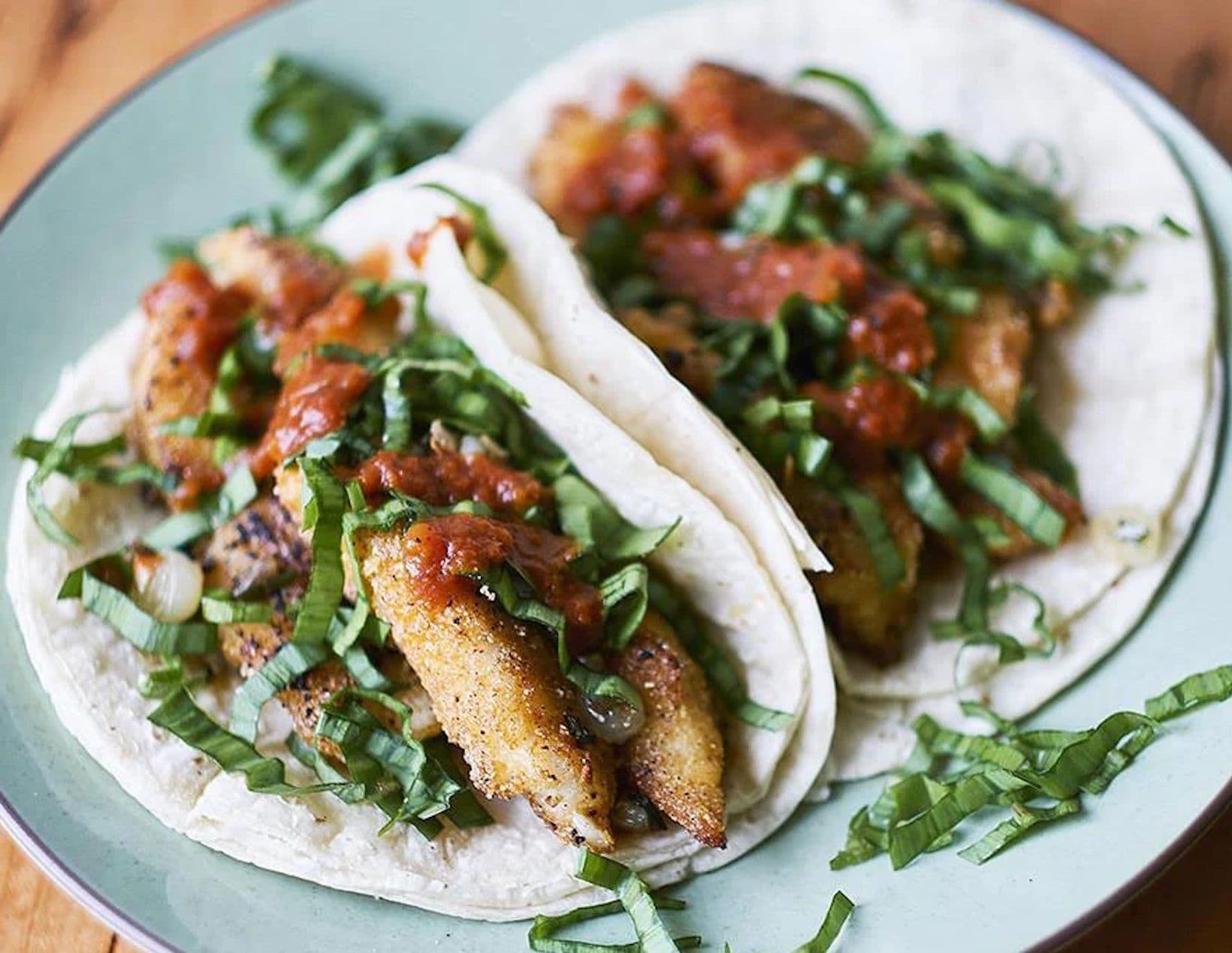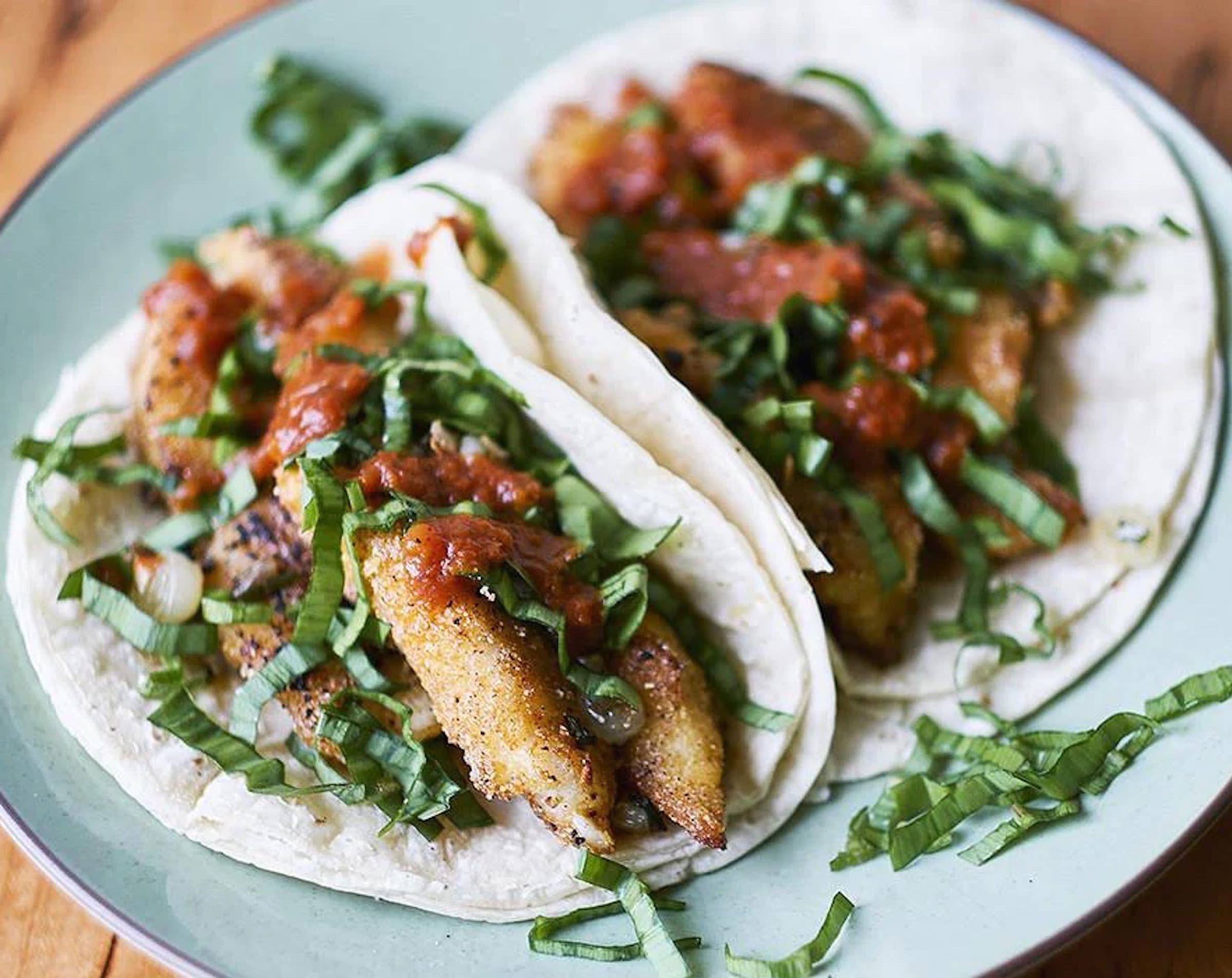 Double up the tortillas to make 4 tacos. Place some fish in the middle of each taco, add sautéed ramp bulbs, a generous heap of ramp greens, and drizzle with salsa. Serve hot—happy noshing!