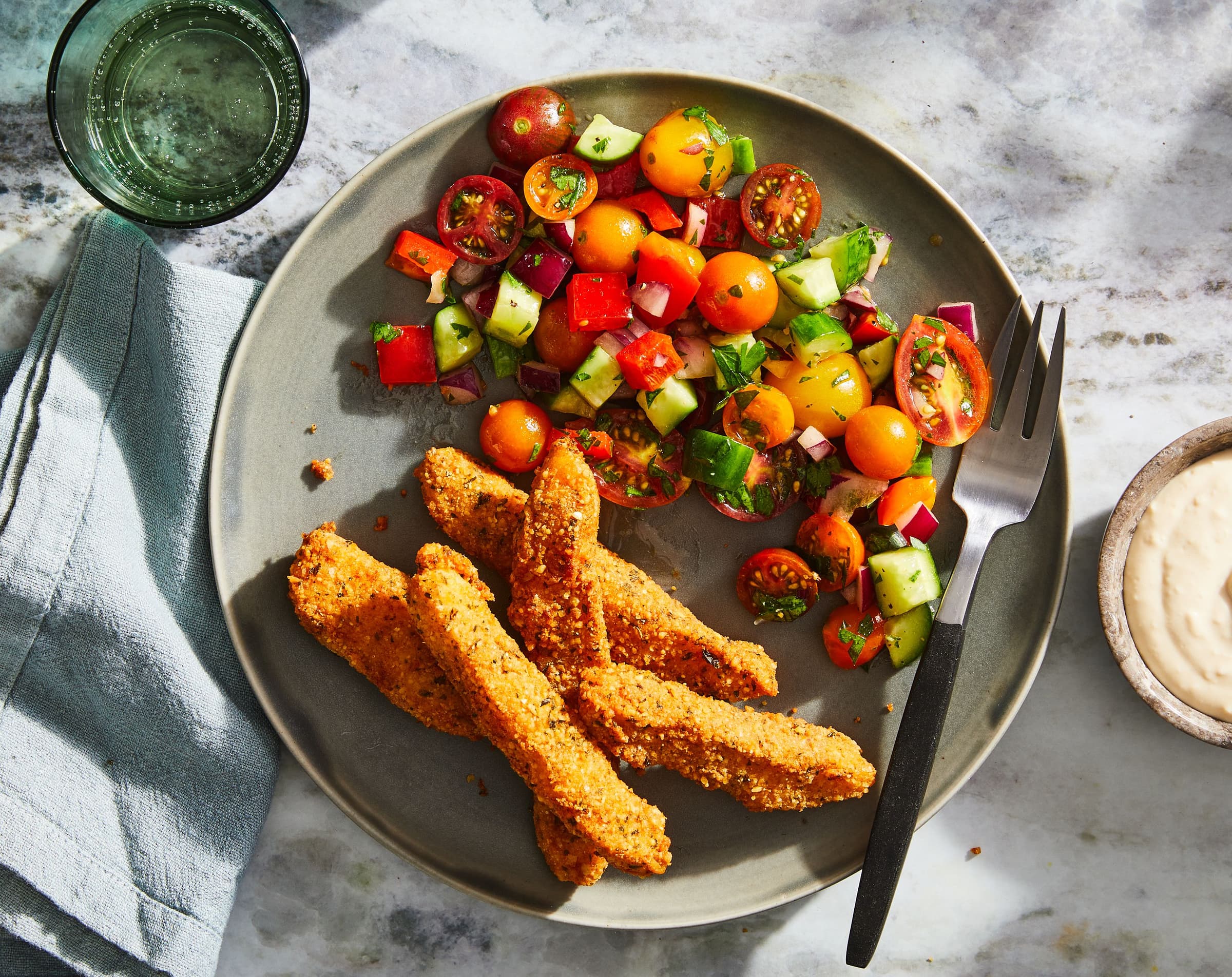 Fish fingers get a Middle Eastern makeover with the addition of falafel mix to the breading. Served with a simple salad of chopped vegetables and a rich sesame tahini sauce, this is a terrific meal for a warm summer evening.